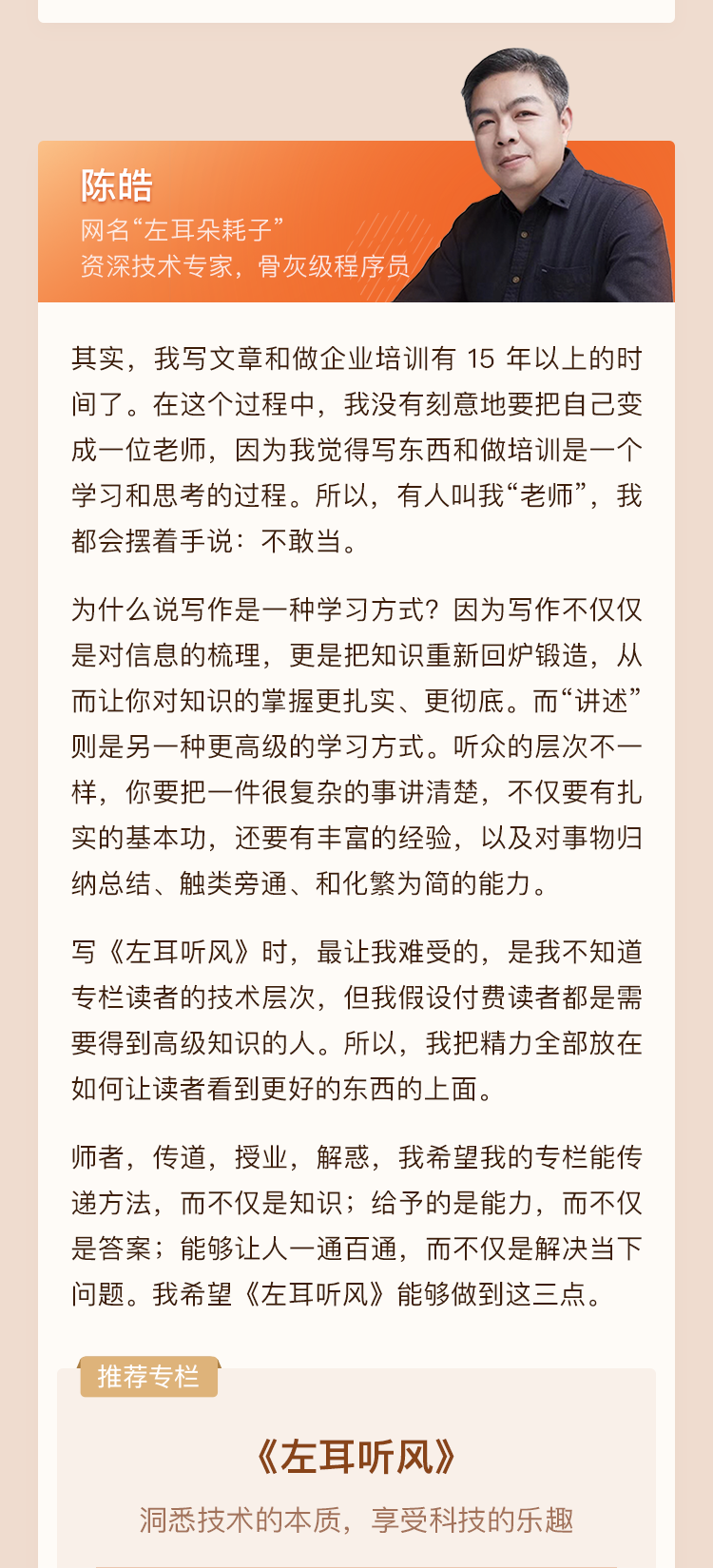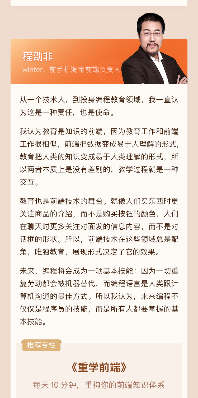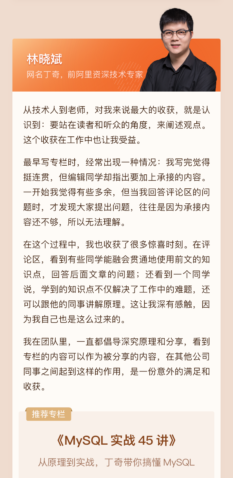 很感谢极客时间 很感谢池老师,个人一年内 从一个试错完成任务的搬砖工 转变为了 研究享受其中乐趣的真正在编码顺便完成任务的程序员。