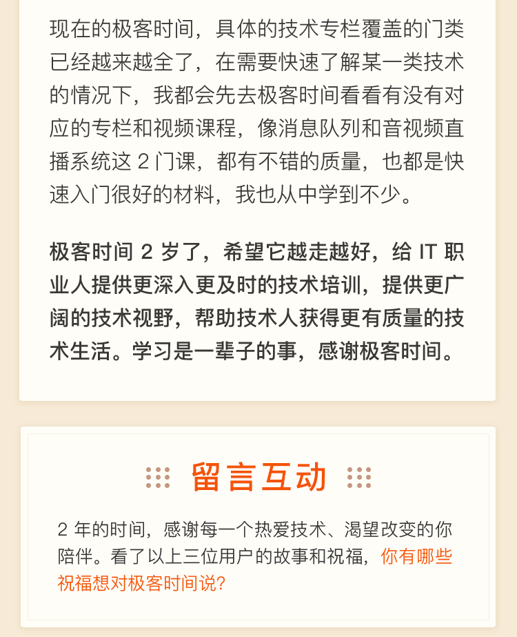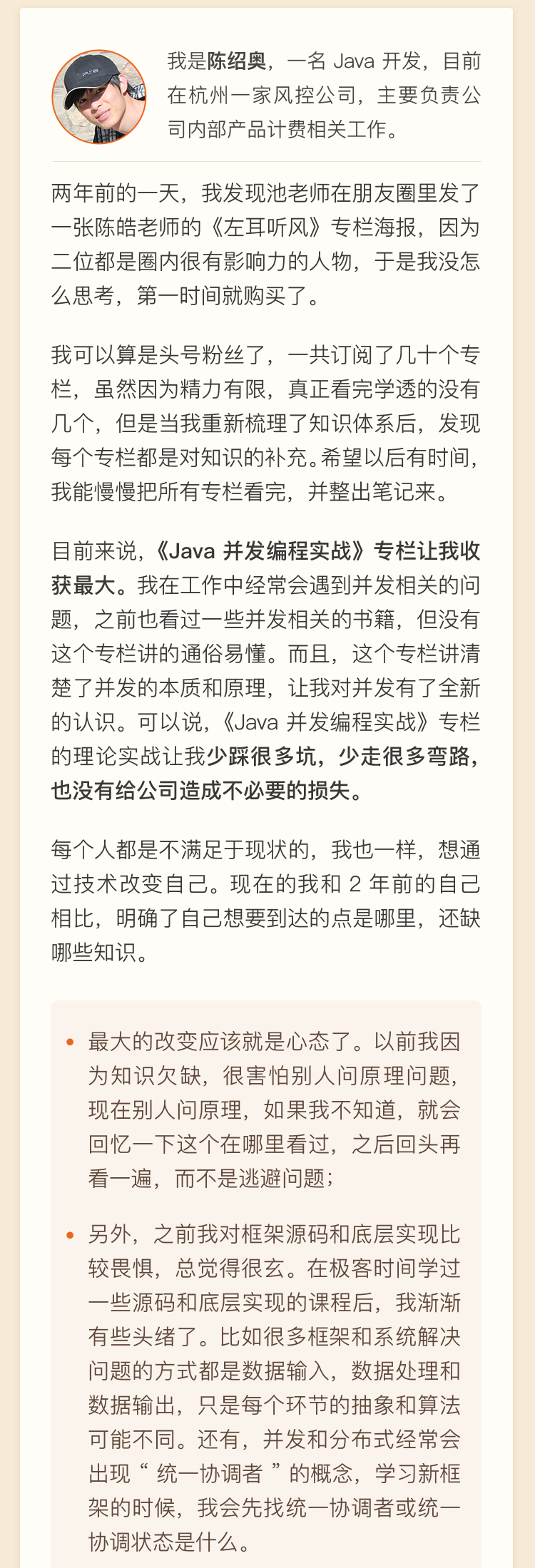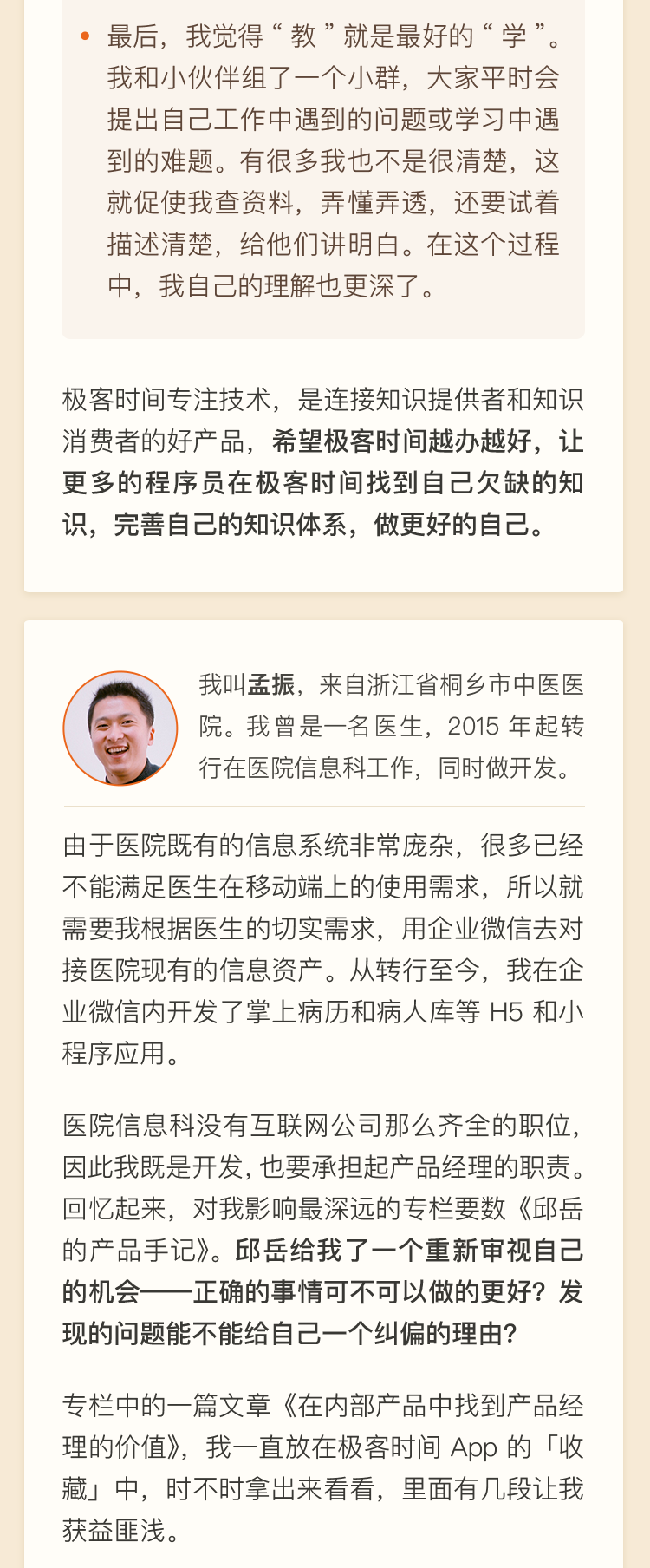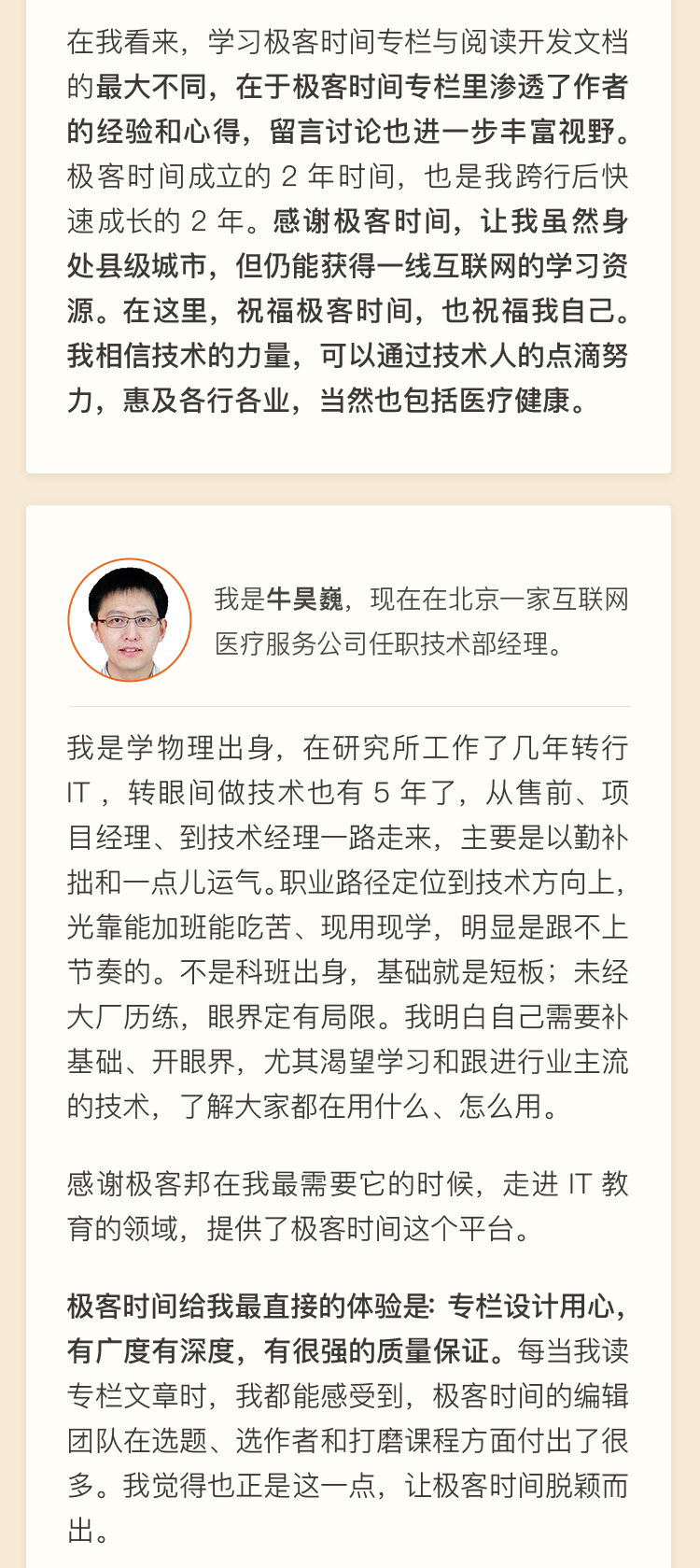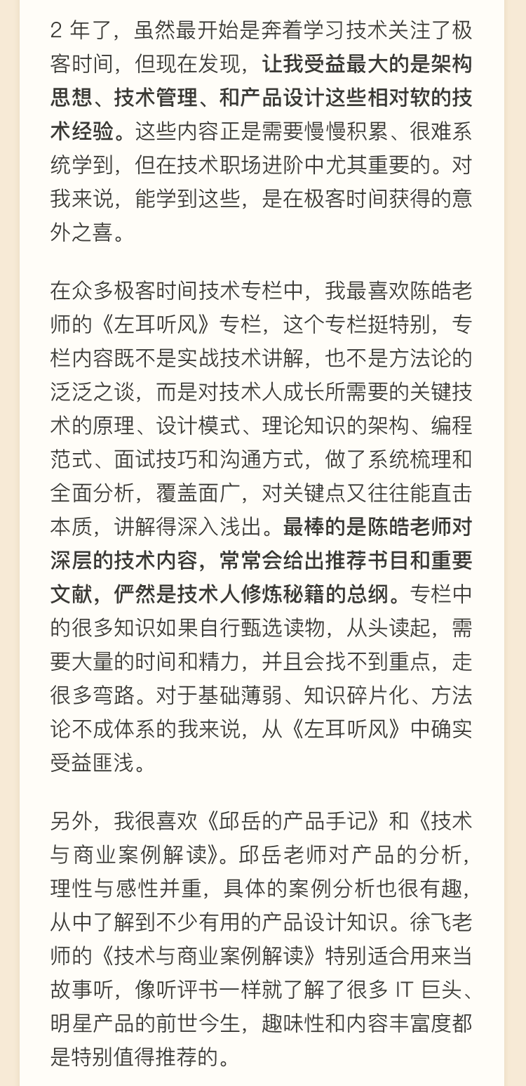 一开始内心很彷徨,有很多困惑。后来也不知道怎么的手机上就多个极客App,可能在一个慵懒无聊的下午,看着身边熟睡的二宝,无意识的点开了极客,碰巧点中了建国老师的“技术管理实战36讲” ,一下感觉到这正是自己一直想找的,于是就这样开始掉“坑”里了,听完专栏又买了书。