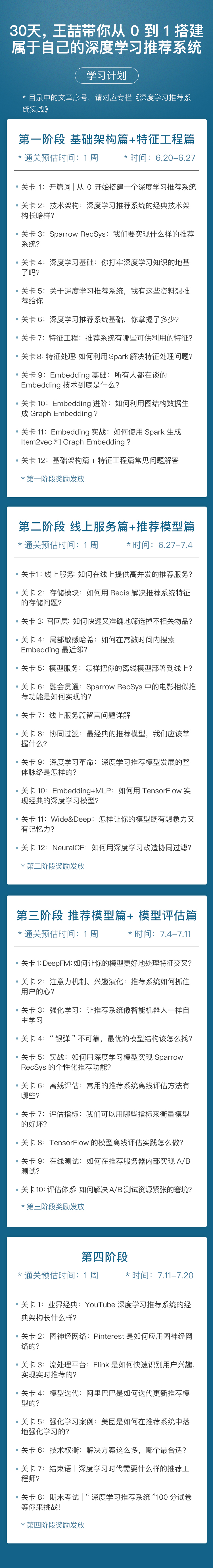 想学习推荐系统,关键在于「体系化 + 实操」。所以,为了让大家可以更好的吃透课程,互相学习和监督,我已经把 44 讲专栏拆分成 4 个学习阶段,并根据内容制定了一份切实可行的学习计划,让你从 0 到 1 搭建属于自己的深度学习推荐系统!