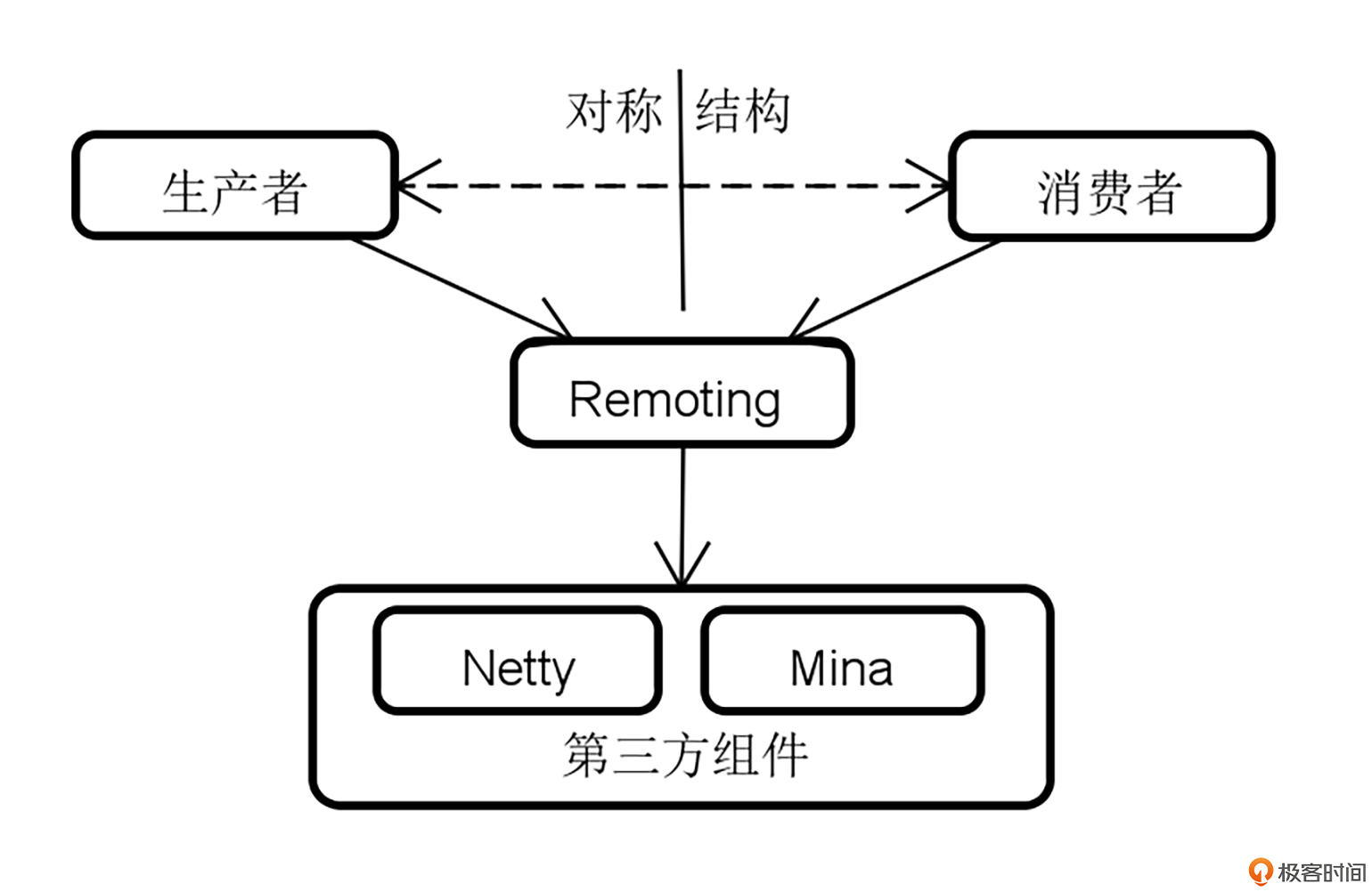 从技术分层上讲,Remoting 模块处于整个 Dubbo 框架的底层,是实现远程服务发布和消费的基础。而且 Remoting 模块的组件呈现的是一种对称结构,即 Dubbo 的生产者和消费者都依赖于底层的网络通信。而在 Dubbo 中,真正实现网络通信的过程也是委托给了第三方组件。
