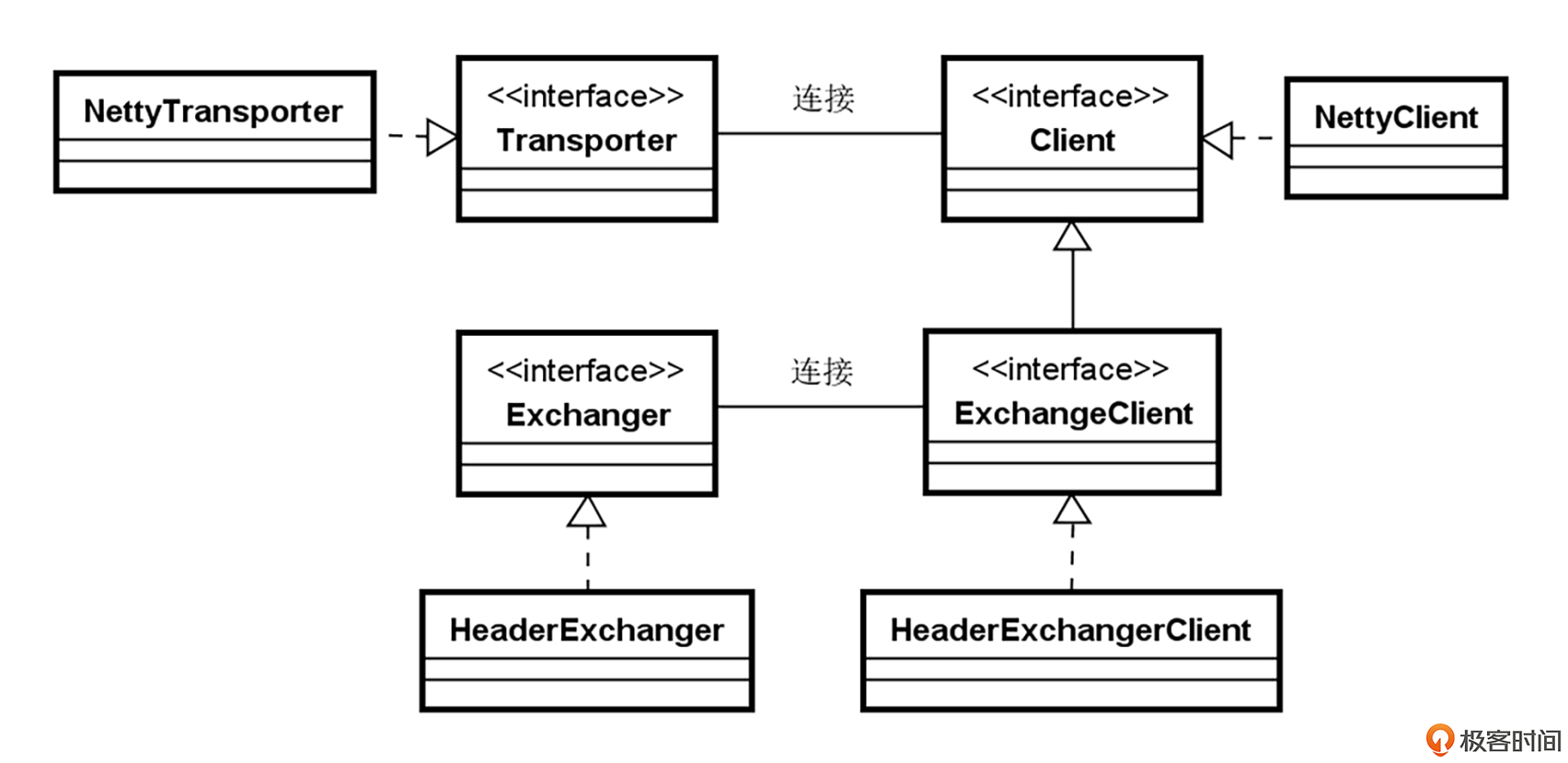 有了对前面服务器端各个技术组件的介绍,理解 Dubbo 客户端通信原理就会容易很多。我们在介绍服务器端时所引入的 Exchanger 和 Transporter 接口都同时包含了对客户端方法的定义,而 Transporter 的实现类 NettyTransporter 也同时会创建一个 NettyClient 类。