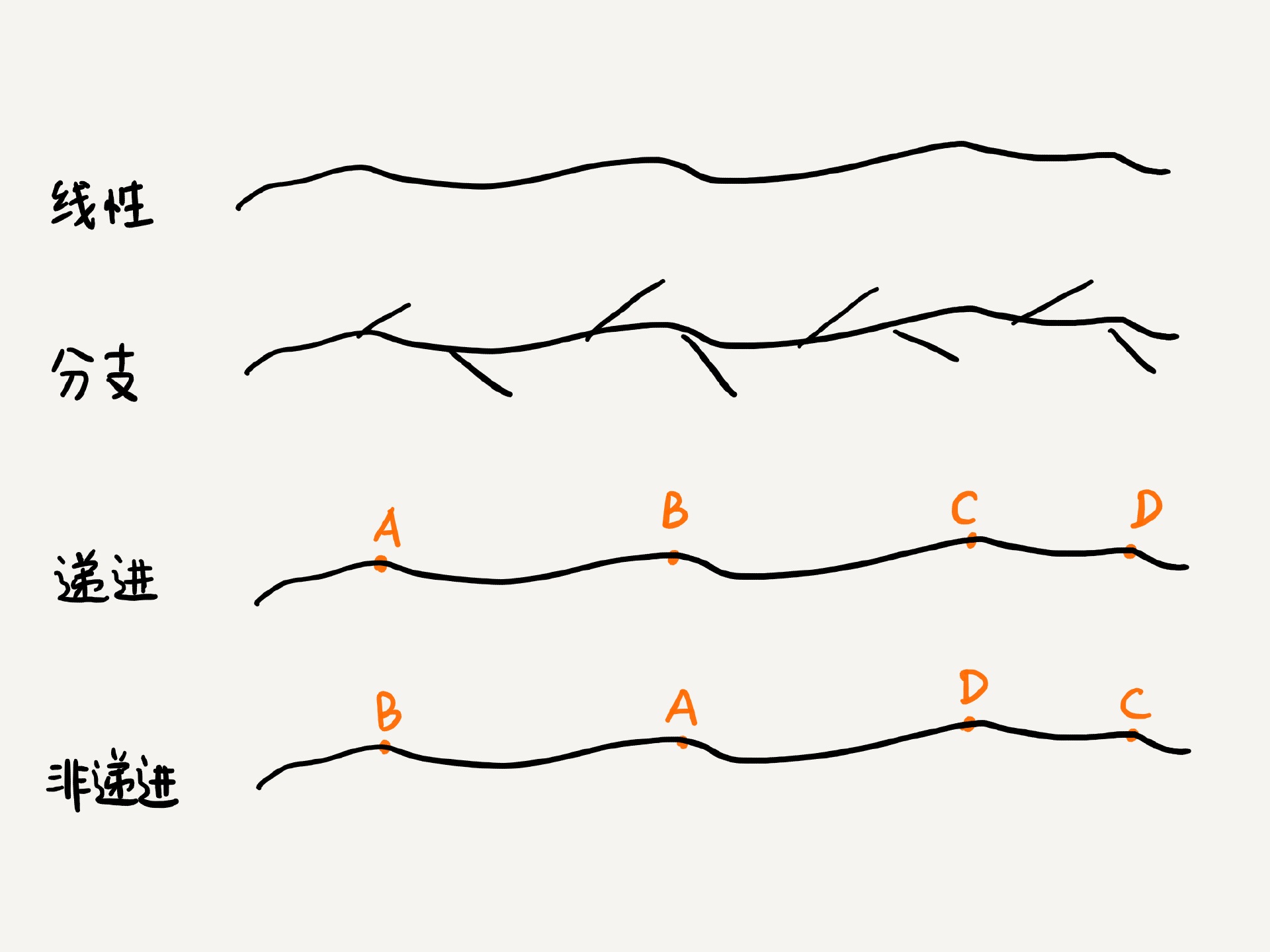 这句话的要点总结起来其实就是一个我们经常看到的词——线性递进。如果你看过《金字塔原理》这本书的话,应该不陌生。我画张图来表示。