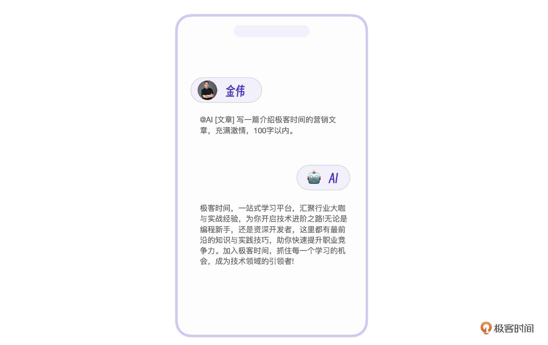 先说营销文章功能,他其实是整个 AI 营销系统的核心功能。下面有一张示意图,是我让 AI 写了一篇介绍极客时间的营销文章。产品的界面看起来很简单,不过呢,后端的实现其实总共经历了 3 个阶段,微调 + 信息储备,增加规则引擎以及 GPT 改写。