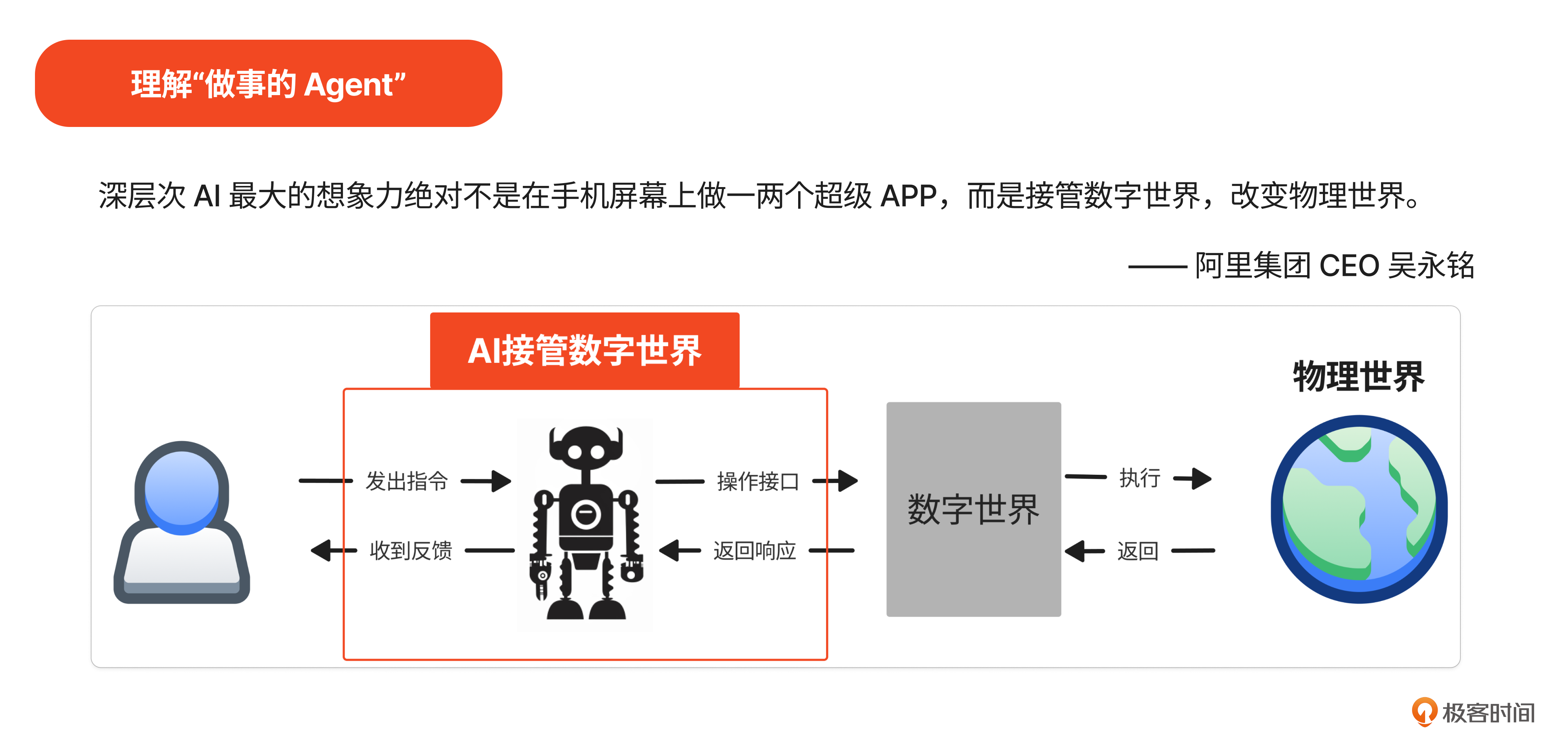 而 AI 带给我们的,就是把人类从数字世界中解放出来,让 Agent 代替人类完成这一链接。