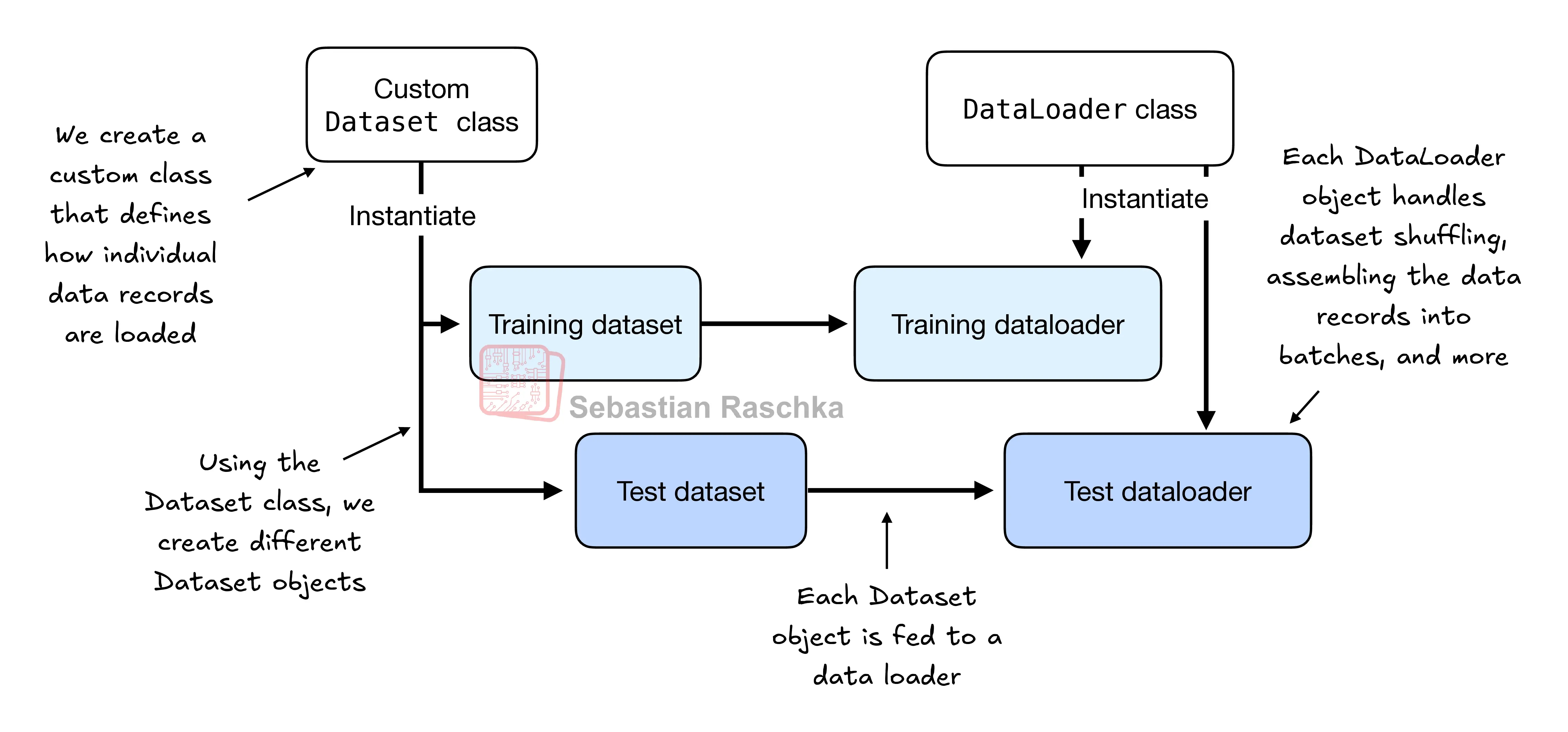 根据图 1 中的说明,在本节中,我们将实现一个自定义的 Dataset 类,我们将使用该类创建训练集和测试集,然后使用这些数据集创建数据加载器。