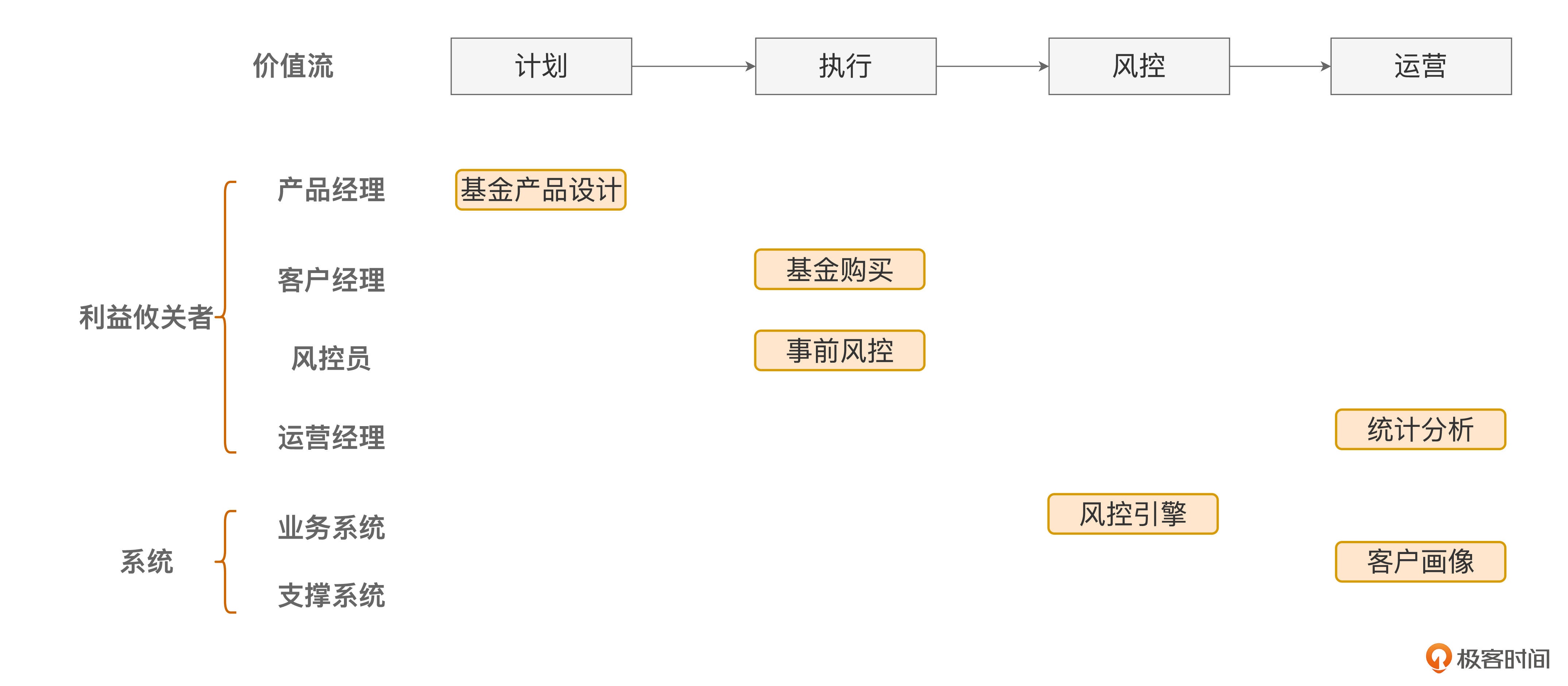 业务能力的呈现方式,通常可以采用“服务蓝图”来表达。我们知道,每一个业务能力的背后都对应着一个业务流程。在服务蓝图中,只需要将该流程的发起者(即流程的触发来源)作为利益攸关方(Stakeholder)列出来即可。