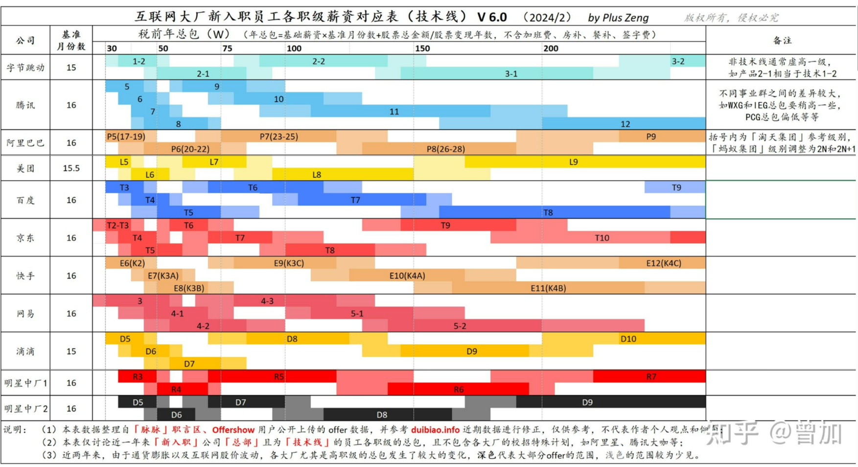 在互联网企业的职场生态中,晋升体系构成了技术人员职业发展的核心框架。下图来自知乎的 @曾加,根据脉脉数据整理的大厂职级对应关系。以阿里为例,5-9 级分别对应工程师、高级工程师、技术专家、高级技术专家、总监岗位。