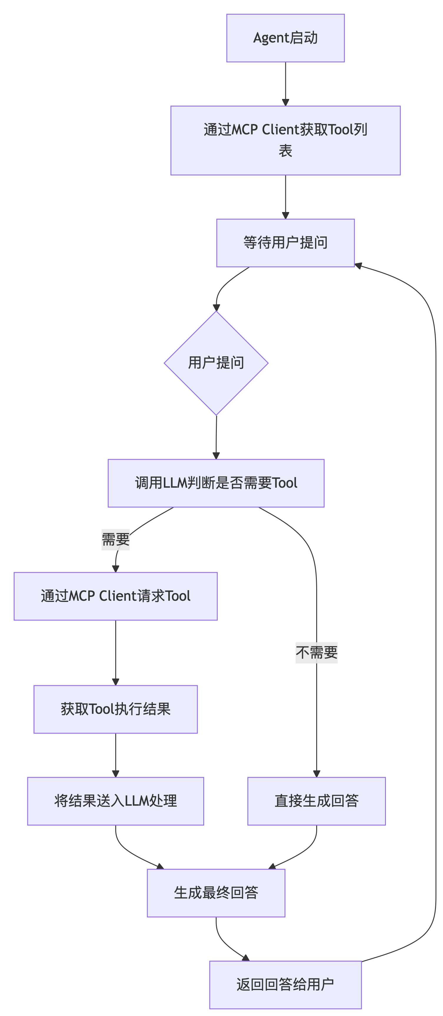 用户提问,Agent 调用 LLM 判断是否需调用 tool;