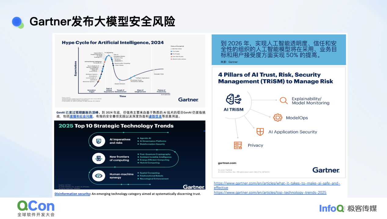 根据去年年底 Gartner 发布的一份报告,大模型技术已经渡过了爆发期,开始向成熟期演变。在 2025 年的 10 大技术趋势中,虚拟信息安全位列前三。同时,Gartner 预计到 2026 年,人工智能技术整体的安全信任度与透明度会有 50% 的提升。