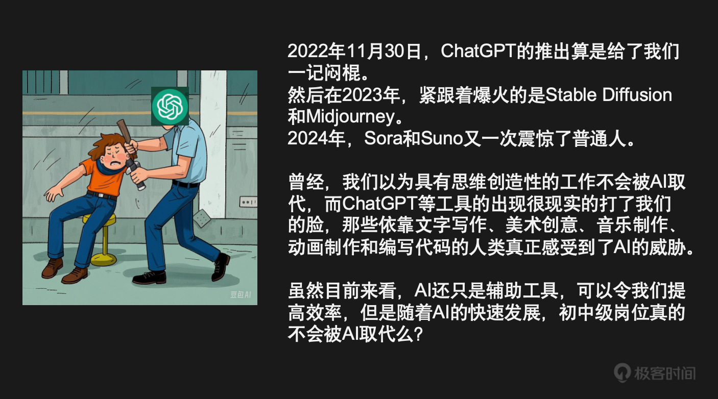 人工智能这个概念其实已经存在很多年了。以前大家总觉得,AI 无非就是通过机器学习这类方法,去找个更优解——比如棋牌游戏里的陪打机器人。但它远没有现在 ChatGPT 这种大模型来得智能,更谈不上有创造力。而 ChatGPT 的出现,真的打破了我们过去对人工智能的想象。和它对话时,你甚至会觉得像是在和一个有思想、能创造的人交流,这点确实挺让人惊讶的。我们原本一直认为,写代码、写文章、做美术、搞音乐这些需要人类思维的工作,是不太可能被 AI 替代的。可 ChatGPT 出来之后,反而感觉我们这些从业者成了最先受到冲击的一批。