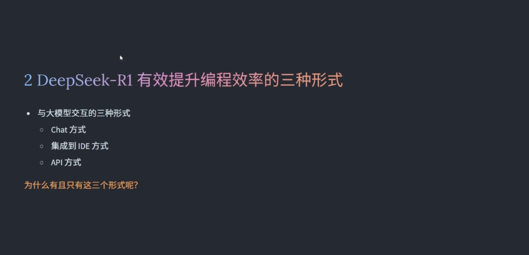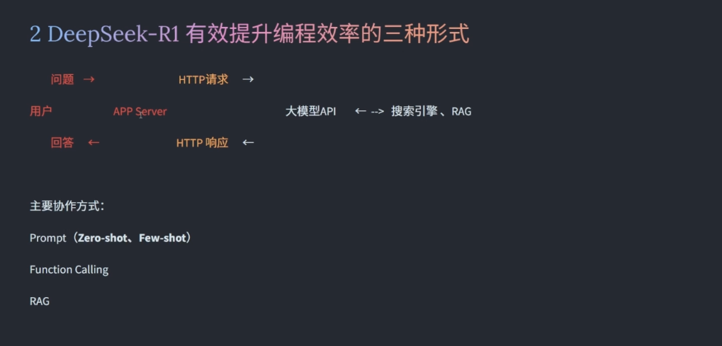 如果我们把 DeepSeek R1 看作一个函数,那么它的输入、处理、输出方式都发生了明显变化。那我们怎么把它嵌入到自己的开发流程中呢?本质上只有三种形式,也恰好对应软件开发中的三种典型场景: