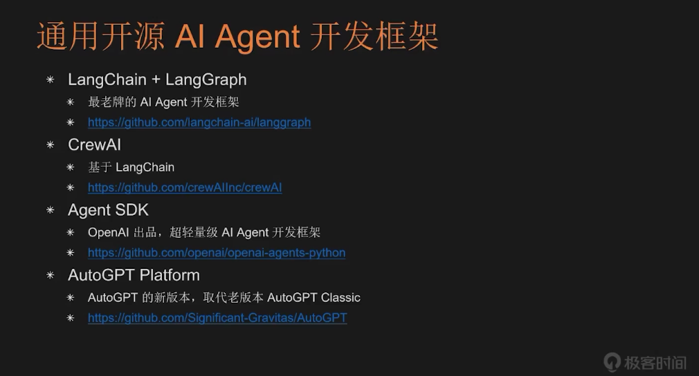 最后一部分是关于开源的 AI Agent 开发框架。首先来看通用型框架,最著名的是 LangChain,可以说它是最老牌的 AI Agent 开发框架,与之配套的还有 LangGraph,两者结合构成了当前应用最广泛的开发方案。不过 LangChain 属于相对重量级的框架,封装层次较深,因此学习和开发成本较高。