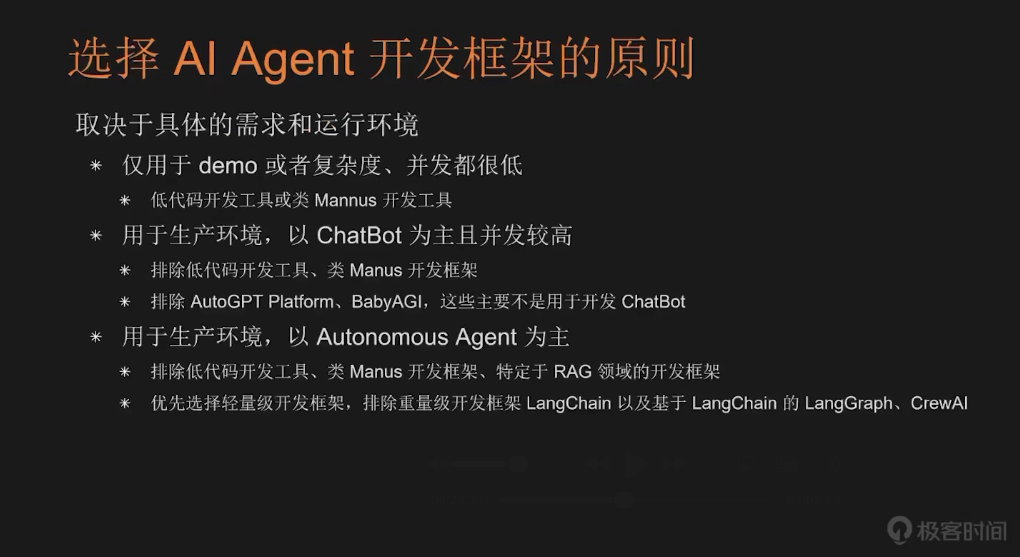 最后我介绍一下选择 AI Agent 开发框架的原则。选择框架的核心原则只有一句话:取决于你的具体应用需求和运行环境。