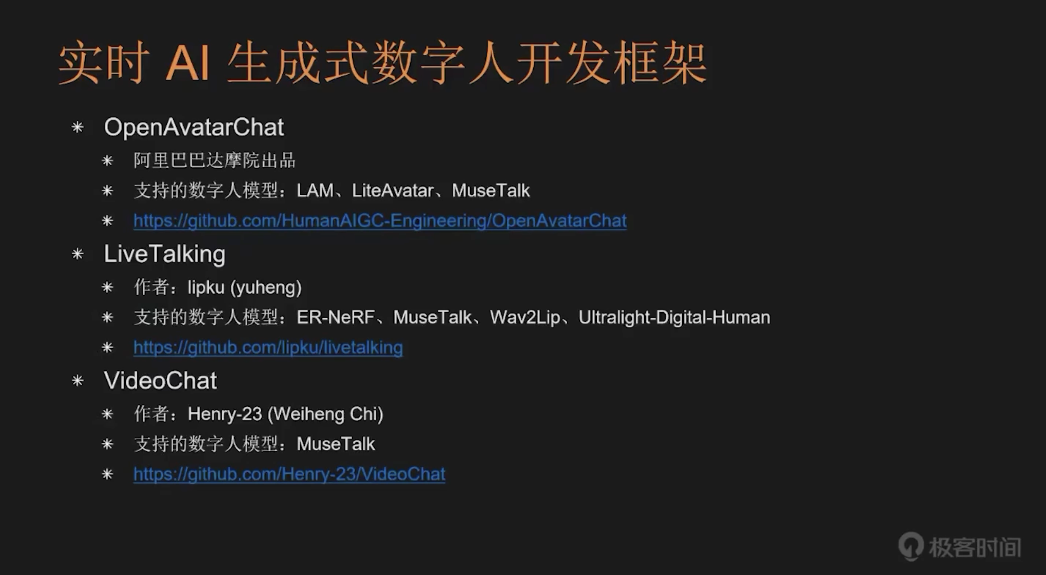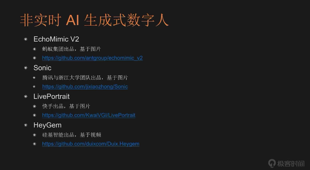 接下来为大家介绍 AI 生成式数字人的开源项目。首先要讲的是非实时类 AI 生成数字人,即基于 AI 模型生成预渲染的数字人视频。目前开源社区中有众多优秀项目: