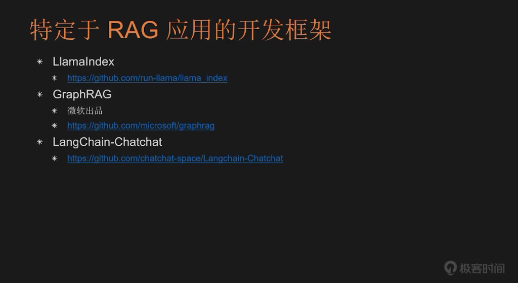 在介绍了通用的 AI Agent 开发框架之后,接下来我将为大家梳理一些专门面向特定类型应用的开发框架。这类框架通常专为开发 RAG(Retrieval-Augmented Generation,检索增强生成)类应用设计,并不太适合开发其他类型的 AI Agent,例如之前提到的 Autonomous Agent(自主型智能体)。这类特定用途的开发框架包括:LlamaIndex、微软推出的 GraphRAG,以及一个由国内开发者基于 LangChain 开发的框架:LangChain-Chat。