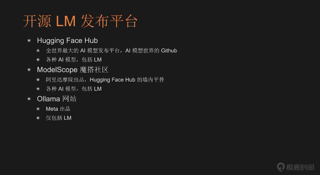 接下来,我为大家梳理一下当前全球范围内主流的开源大模型发布平台。目前主要有三个平台值得关注,首先是 Hugging Face Hub,这是全球最大的 AI 模型发布平台,可以把它比作“AI 界的 GitHub”。正如 GitHub 是全球最大的开源代码托管平台,Hugging Face Hub 则是 AI 模型领域最具影响力的开源社区。该平台涵盖了各类 AI 模型,语言模型只是其中之一。