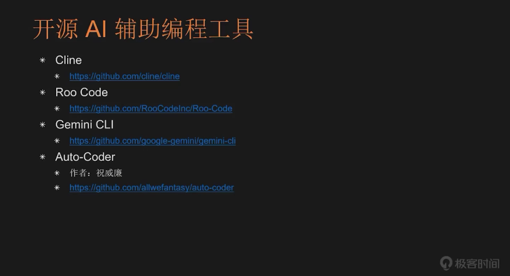 最后为大家介绍开源的 AI 辅助编程工具。当前这类工具的选择很多,而且多数都是开源的。我建议大家优先通过开源工具来体验 AI 辅助编程,因为它们的使用成本极低,几乎是零门槛,唯一需要投入的就是学习时间。