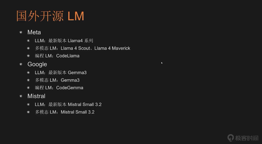 Google 也紧随 Meta 步伐,很早就发布了开源大模型 Gemma,目前最新是 Gemma 3,同样为多模态模型,支持文本、图像和视频交互。Google 还拥有自研的代码生成模型 CodeGemma。法国公司 Mistral AI 也是开源领域的重要参与者,大约两年前就发布了其语言模型,最新版本 Mistral Small 3.2 同样支持多模态。马斯克旗下的 xAI 也开源了模型 Grok-1,并在几个月前透露 Grok-2 将在 Grok-3 稳定后开源,具体时间尚未确定。另外,AI 公司 Cohere 也推出了开源大模型 Command R。