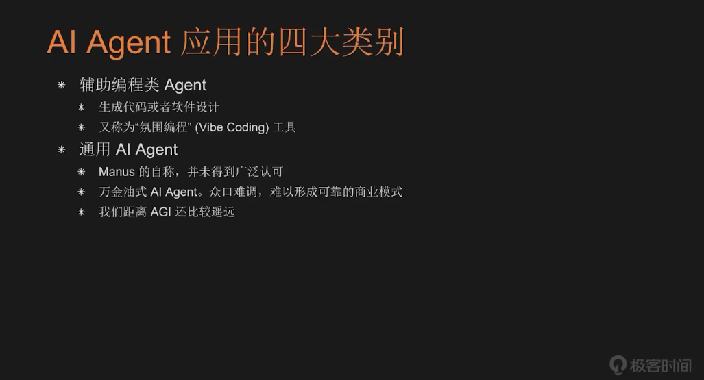 这类 Agent 属于“万金油”型的产品,表面上能够处理多种任务,包括回答问题、生成代码、执行操作等,看似无所不能。但也正因如此,它们在各个垂直领域都不够专业,功能广度牺牲了深度,我认为可能难以形成稳定可靠的商业模式。很多通用型 AI Agent 还常宣称自己在追求 AGI(通用人工智能)。但目前我们距离真正被广泛认可的 AGI 仍然较远,我个人预计还需要 3~5 年的时间才有可能实现实质性突破。