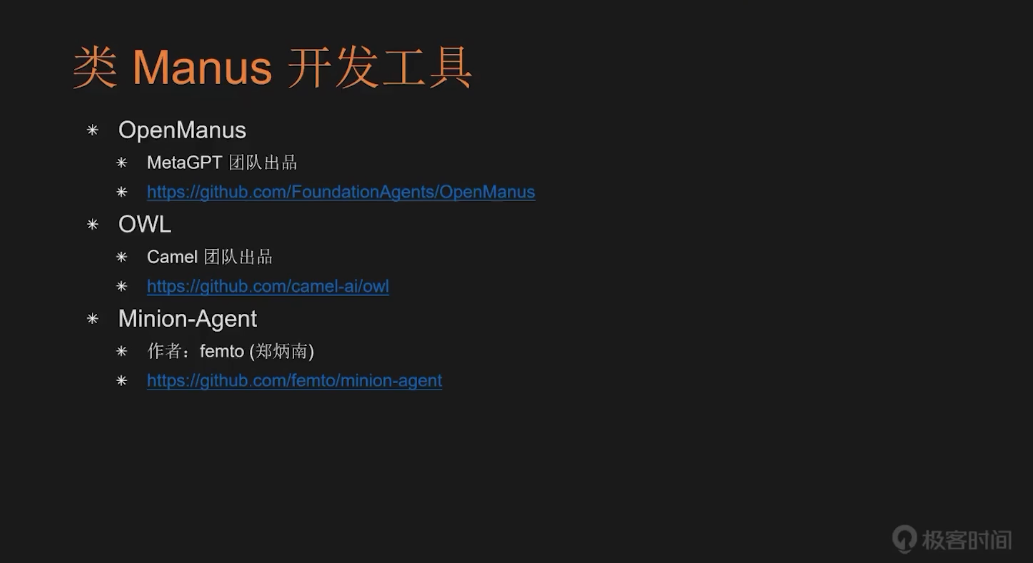 还有一类更高层的开发工具,我将其称为“类 Manus 工具”。之所以这样命名,是因为它们都是在国内知名产品 Manus 发布后相继出现的同类工具。Manus 自称为“全球首个通用 AI Agent”,但这一说法并未得到业界的广泛认可。在这些工具中,有三个较为知名:第一个是 OpenManus,由 MetaGPT 团队推出;第二个是 Owl,由 Camel 团队开发;第三个是 Minion-Agent,是郑炳南老师开发的。这三个项目都是开源的,如果无法获得 Manus 邀请码,可以尝试使用这些作为替代方案。