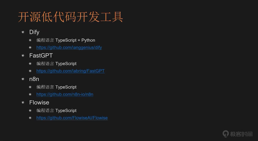 接下来,我们来看开源的低代码开发工具。目前已有不少优秀的开源低代码工具,其中最知名的是 Dify,支持 TypeScript 和 Python。另外还有 FastGPT,编程语言是 TypeScript,国外开发者推出的 n8n,编程语言同样是 TypeScript,以及 Flowable,编程语言也是 TypeScript。这些都是当前主流的开源低代码开发工具。
