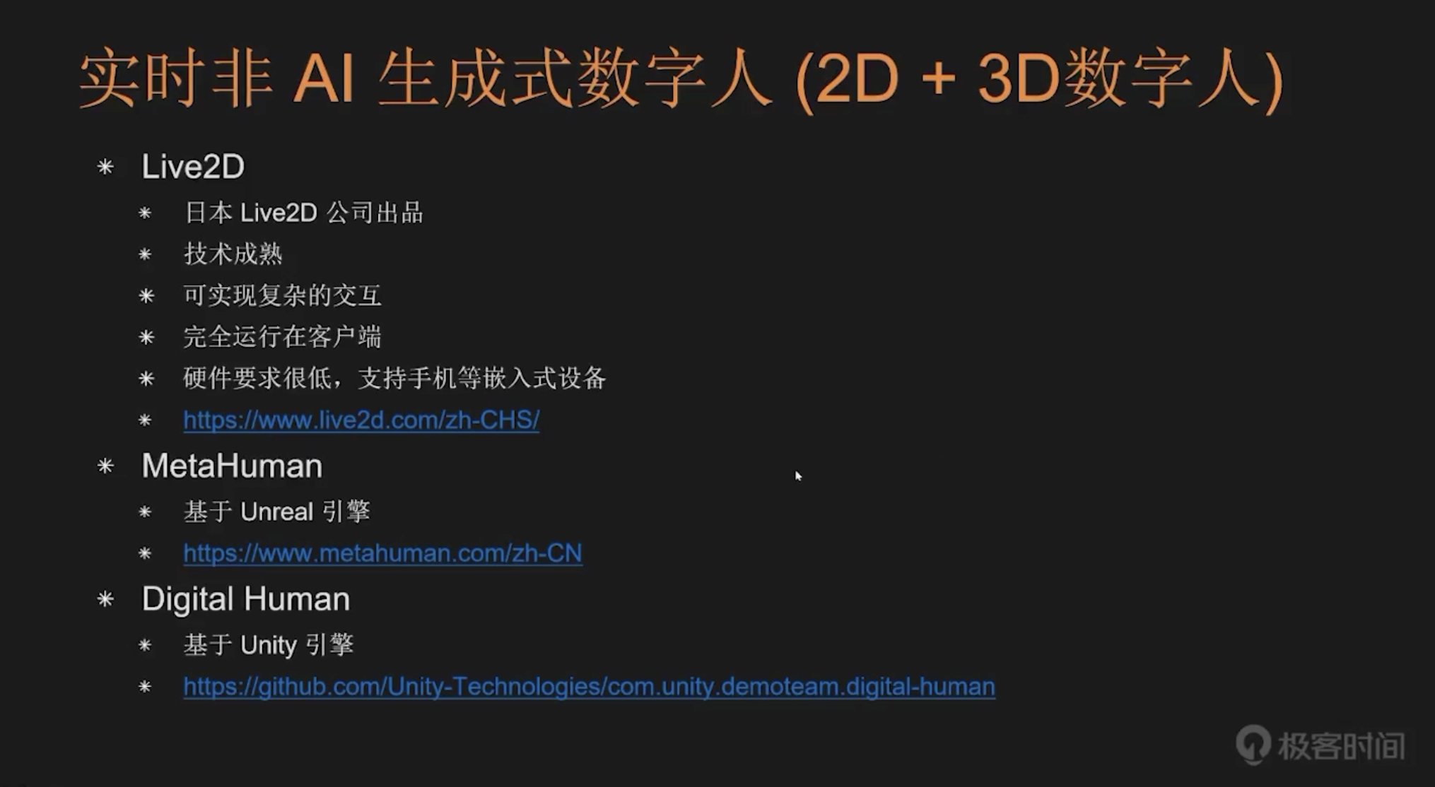 以上就是我今天分享的全部内容,重点为大家系统梳理了实时数字人开发所涉及的各项关键技术。从 AI Agent、开源大模型的选择与部署,到实时数字人的 2D、2.5D 及 3D 技术路线,每一部分都蕴藏着强大的创新潜力。