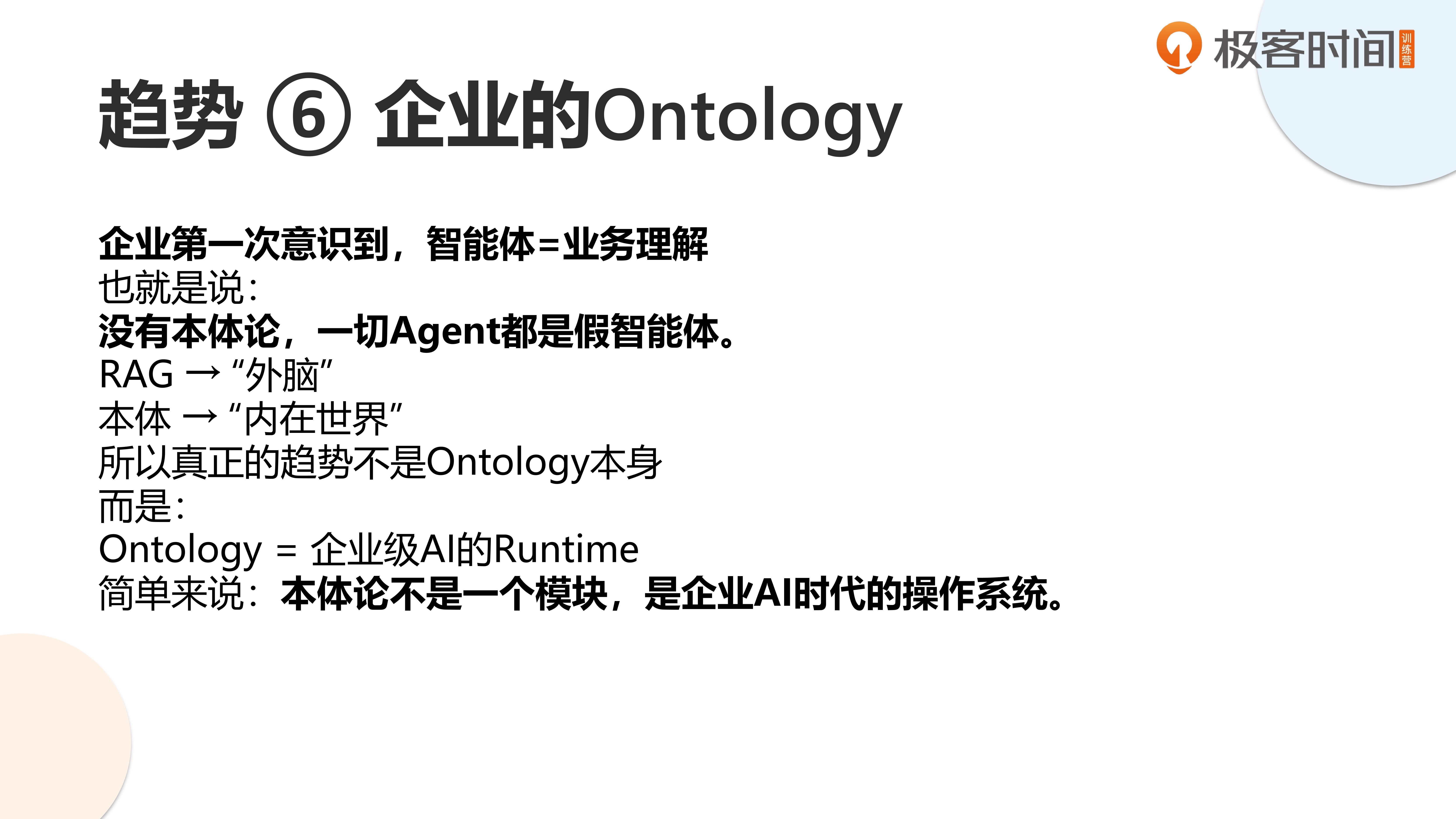 关于企业本体论(ontology)这个概念,我想特别强调一下:如果没有对企业业务的真正理解,我们根本无法开展任何有意义的 AI 应用。你的企业、你的项目如何理解这个世界?如何理解业务逻辑?如何进行组织架构和开发流程?如果缺乏这些结构化的表达,我们怎么可能让智能体理解你到底在做什么?这就像"巧妇难为无米之炊"。企业必须首先梳理自己的方法论、数据和业务流程,将其整理成完整的本体论体系,然后才能谈 AI 智能体的开发。