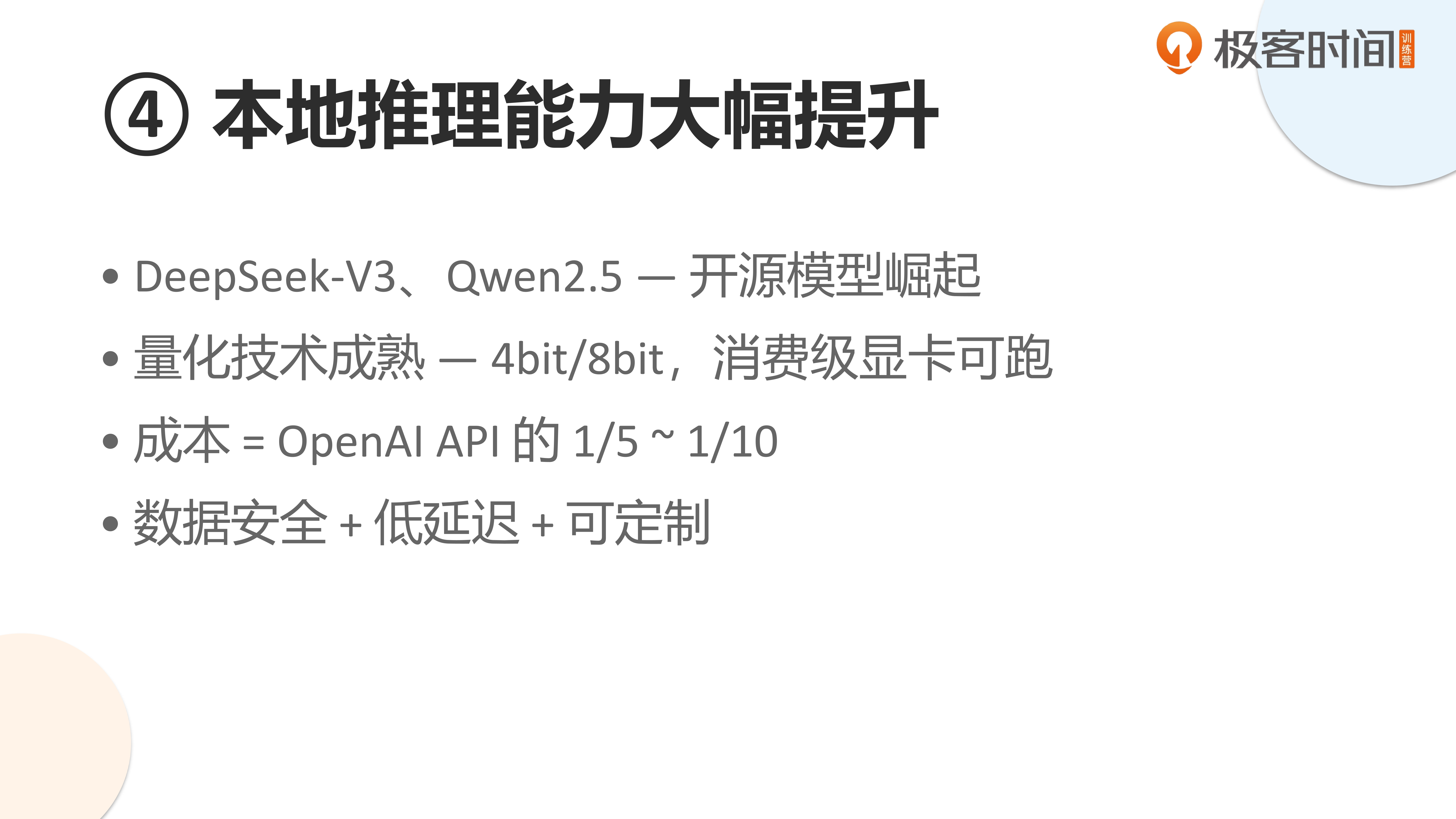 第四个重要进展是本地推理能力的大幅提升,特别是小模型的兴起。以千问 3 为例,这类开源模型物美价廉,让我们能用少量资源(如四张 A100 卡)本地部署千问 3 的 8B 或 20B 版本,处理财务文章检索、数据提取甚至计算等实际任务。本地推理加端侧小模型,让许多应用成为可能。