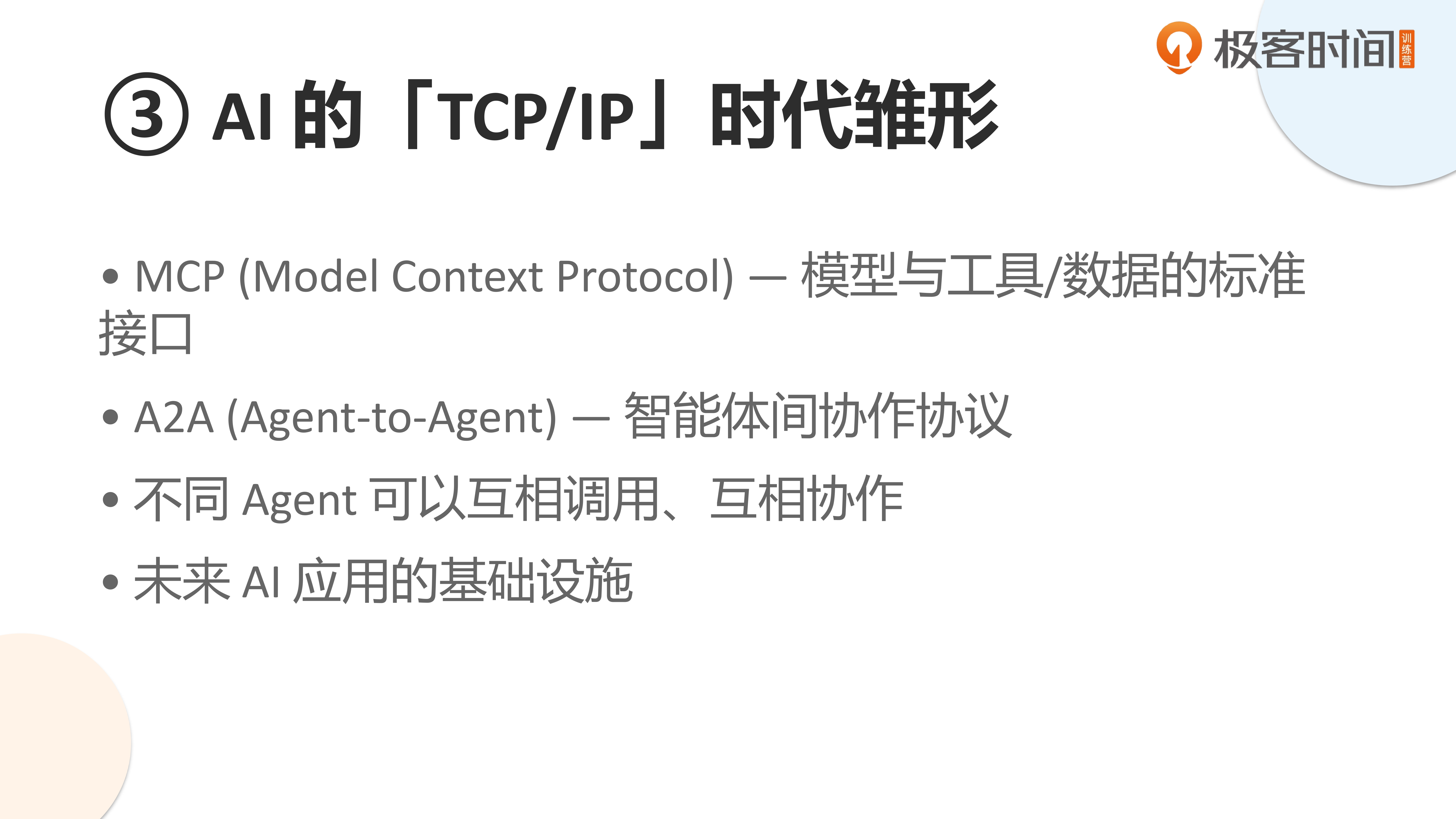 第三,我认为今年是“AI 的 TCP/IP 时代”的雏形建立之年。2024 年 Anthropic 推出 MCP 协议,开启了 Agent 间的互联;2025 年 4 月 Google 推出 A2A 协议。这两个协议为未来智能体的互操作奠定了基础。虽然全面实现为时尚早,但这是历史必然。2024-2025 年就是 AI 互联网的元年,MCP 和 A2A 协议将推动 AI 基础设施逐步完善,其发展会像互联网和移动互联网一样迅速。如果你的公司正在开发 MCP 服务或推进 Agent 互联,那么恭喜你,你走在了前沿。这些技术积累在未来十年、二十年都会持续发挥价值。