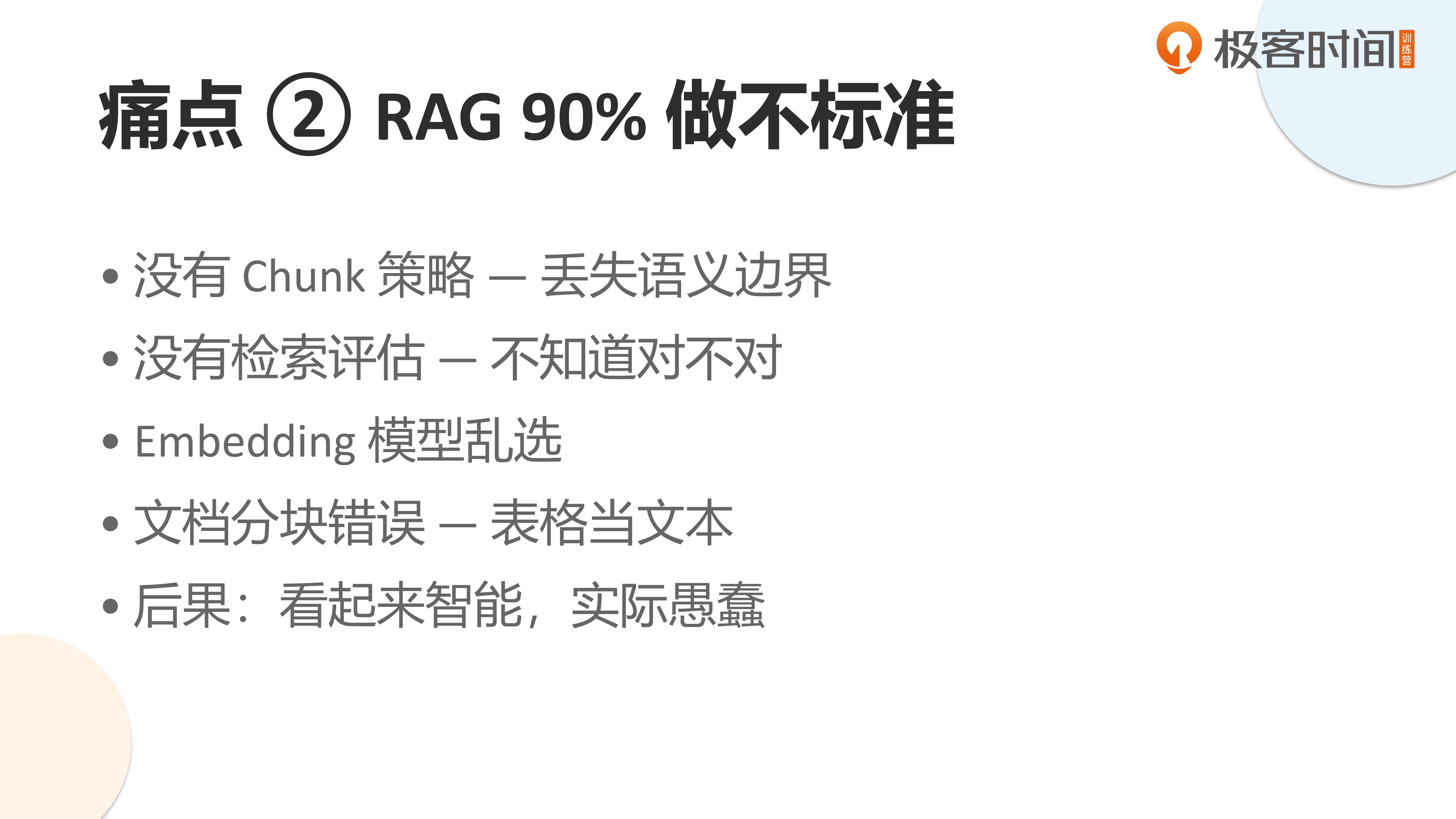 第二个痛点是 RAG 技术细节极其复杂。建议大家参考我的 RAG 课程代码(GitHub 仓库“rag-in-action”),其中涵盖了分层索引、PDF 文档分块读取等具体解决方案。如果这些基础环节处理不当,整个系统就无法有效工作。本质上,这考验的是企业的知识工程能力与现有文档质量水平。