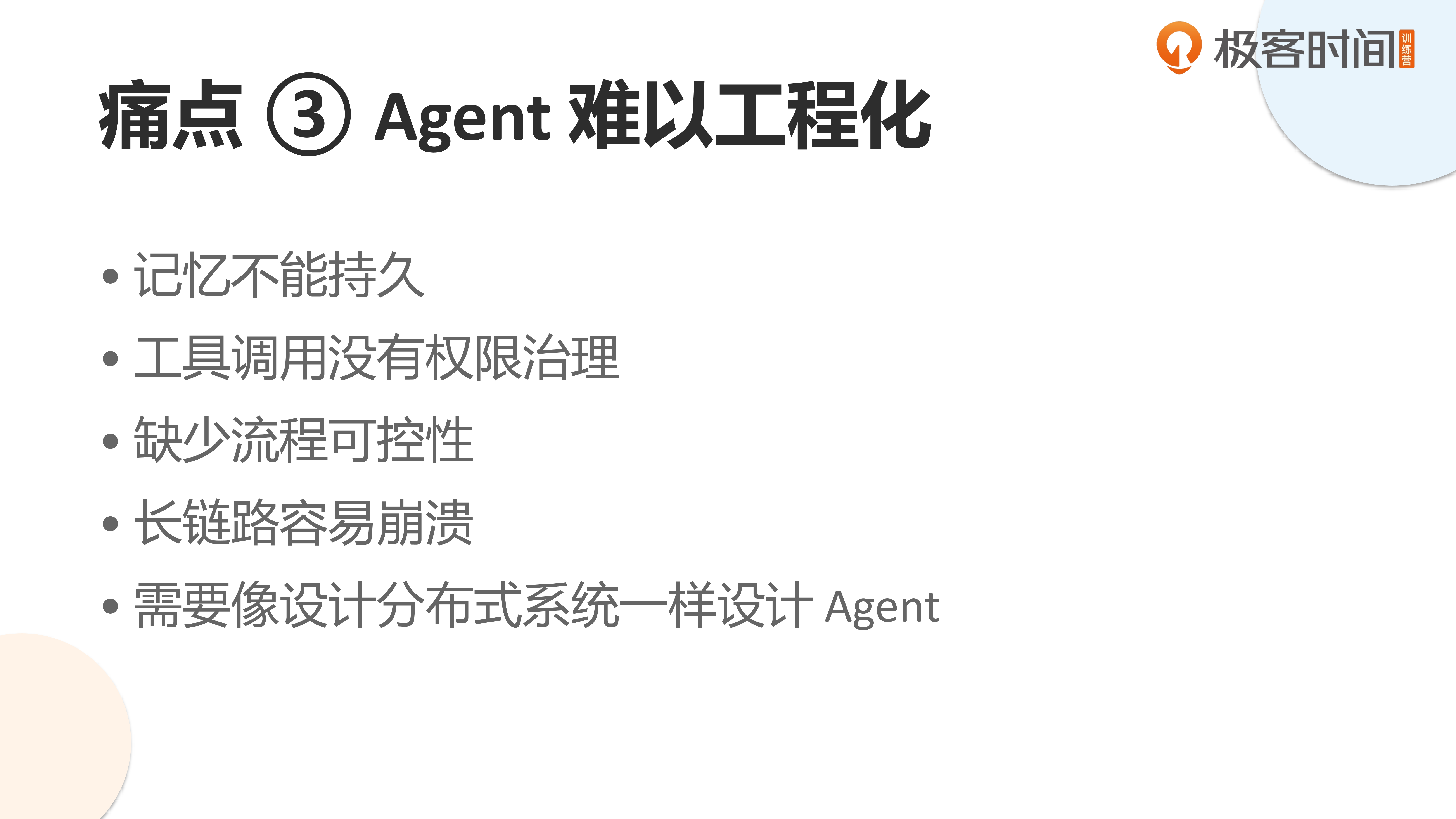 第三个难点是 Agent 的工程化落地。为什么 Agent 在实际应用中常常表现不稳定?很大程度上是因为企业自身的业务流程不够清晰。当上下文工程做得不到位时,Agent 的状态管理就会混乱。这反而凸显了我们工程师的价值:如果大模型能直接套用就完美工作,那我们的专业能力还有什么意义?正是这些痛点体现了我们的不可替代性。