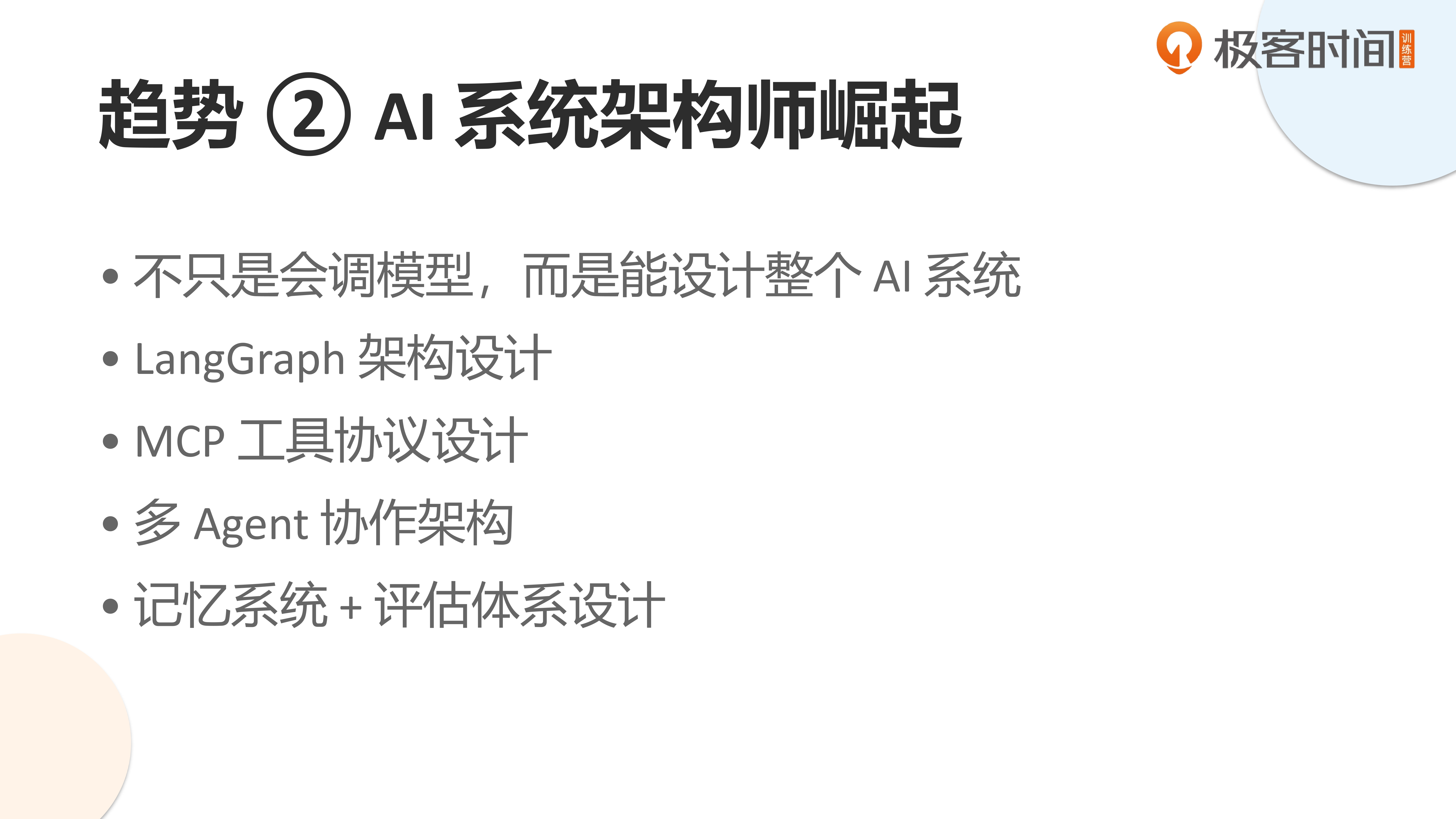 同时,我们正进入 Agent 时代,这个时代最需要的是 Agent 架构师。如何成为 Agent 架构师?目前市面上可能还没有成熟的课程,但这正是大家需要自主学习的方向:深入研究 LangGraph、MCP 协议、多智能体协作、记忆系统管理、上下文工程、智能体调度等关键领域,并结合自身的企业项目和业务领域去实操、思考,你就能成为你企业里的第一位 Agent 架构师。