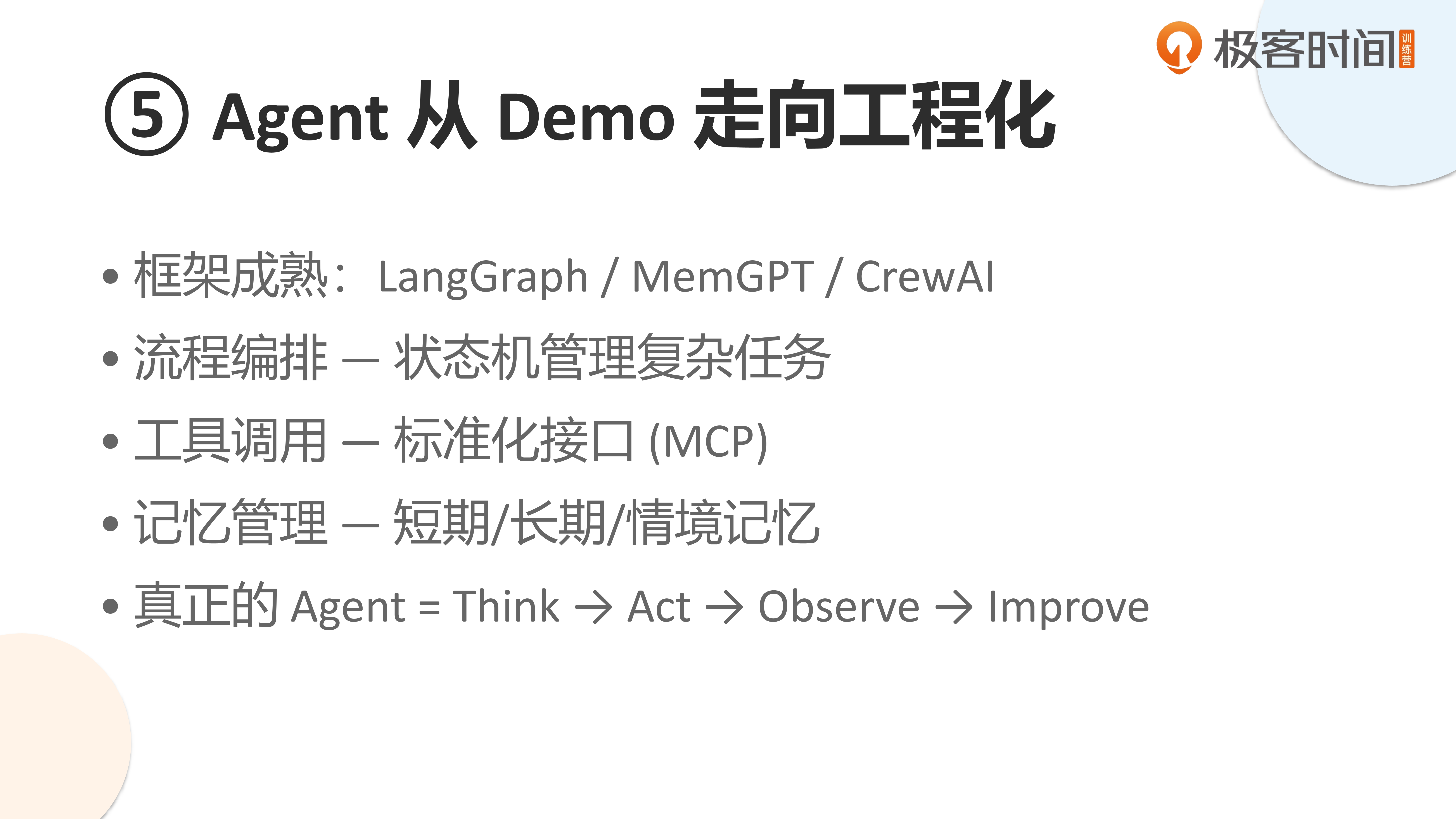 第五个重要的观察是 Agent 正从 Demo 走向工程化,但这个过程充满挑战。目前还没有成熟到能让 Agent 在企业中顺畅运行的程度,工程化能力尚显不足。成熟的框架和工具调用能力虽已具备,但距离“两个月打造一个高效 Agent”仍不现实。稍后我会详细分享其中的难点。
