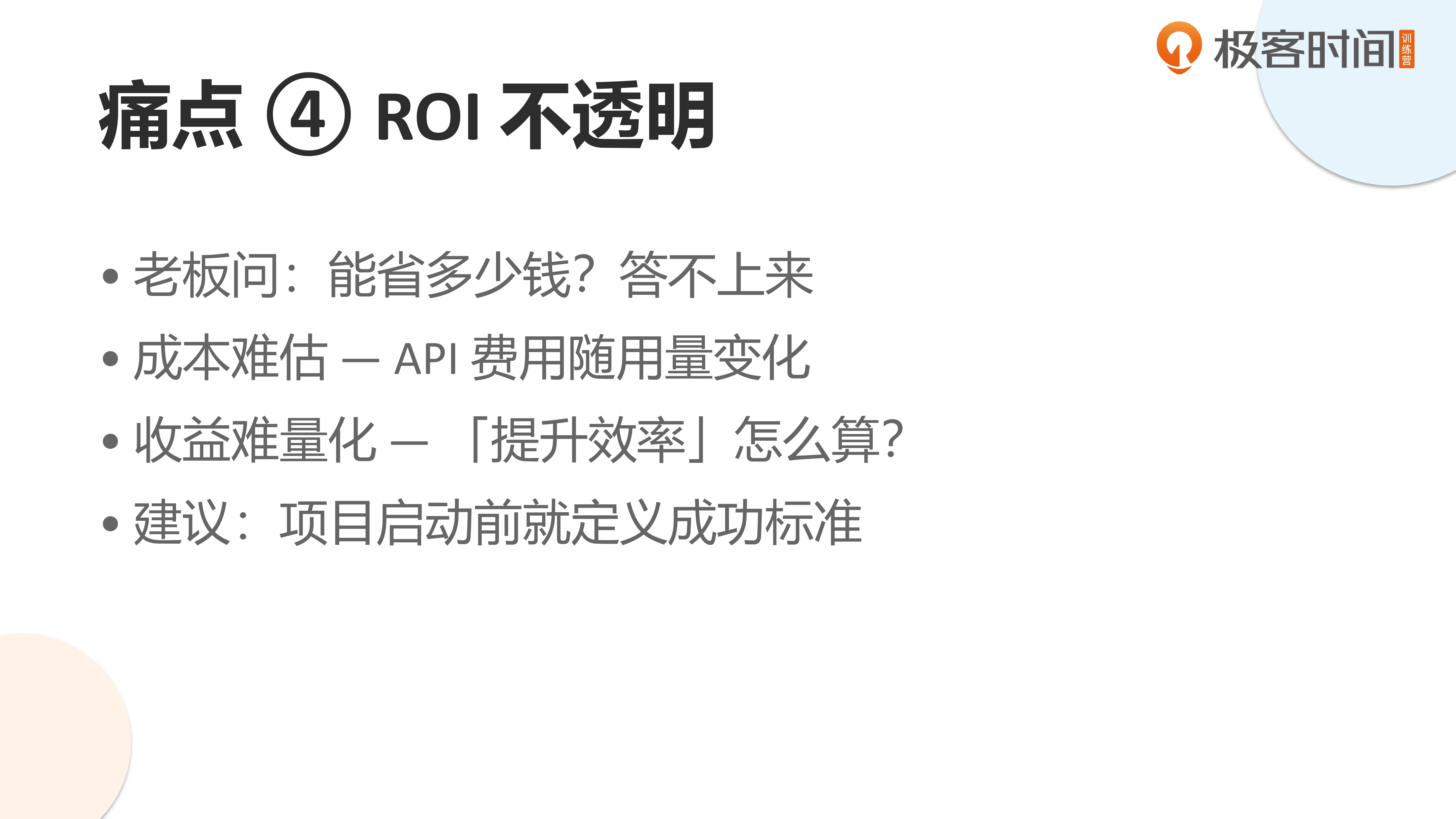 第四个问题是投资回报难以量化。一个 Agent 项目到底要投入多少成本?能带来多少效益?很多收益是隐性的,很难简单说清具体能降本增效多少。但这并不意味着项目不值得做,而是需要我们建立更科学的评估体系。