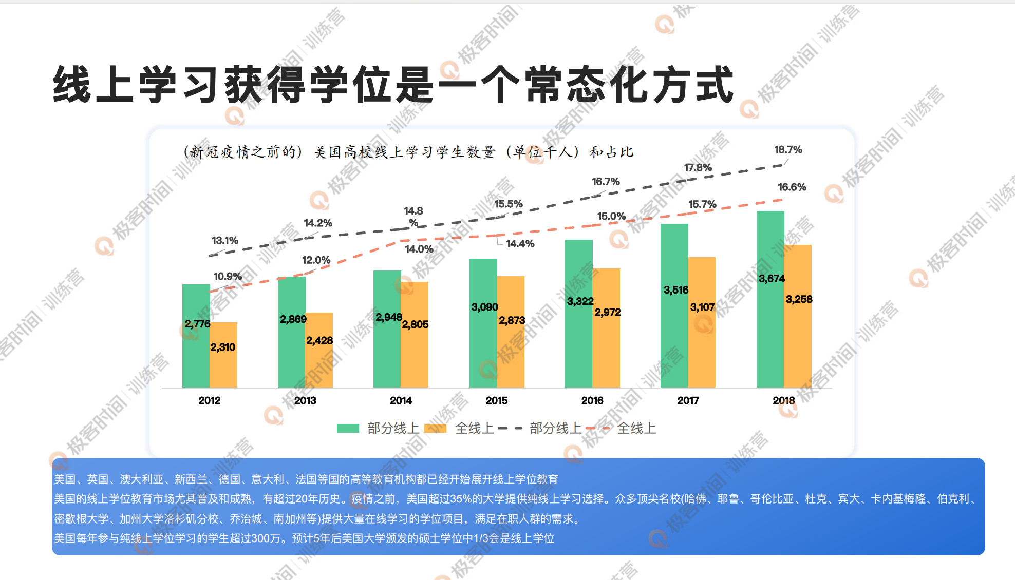 到底什么是国际在线硕士呢?我们在讲什么是国际在线硕士之前,还是要跟大家去共识一下:海外在线学习的方式是一个非常常见、常规、常态化的方式。像英国、美国、澳大利亚、新西兰、德国、意大利、法国等国的高等教育机构很早就已经开展线上学位教育,尤其是美国的线上学位教育是最成熟的,有超过 20 年的历史。
