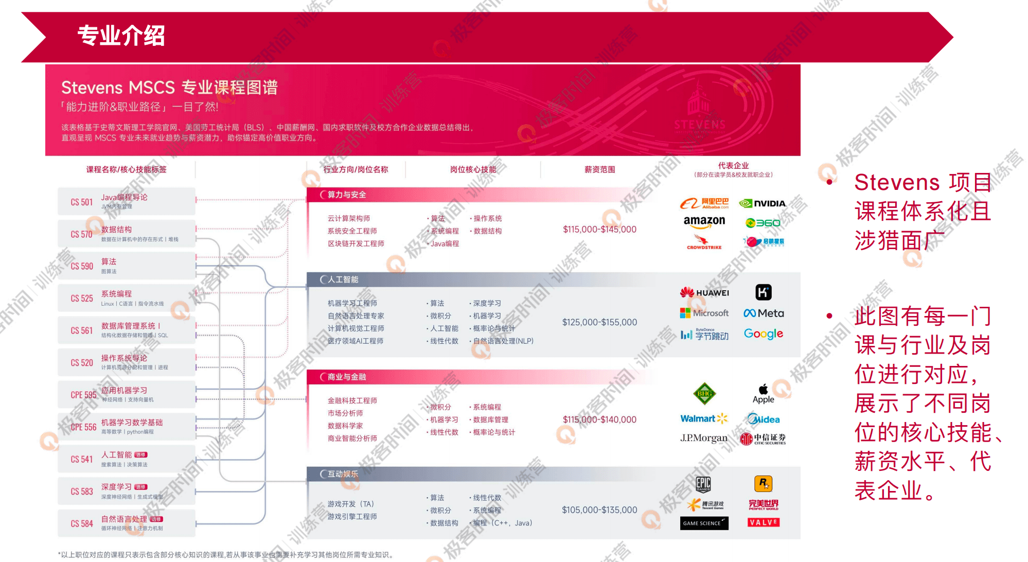 我们可以看一下这些课程内容,比如说 Java 编程导论、数据结构、算法、系统编程、数据库应用、机器学习的数学基础、人工智能、深度学习、自然语言处理等,这些都是非常硬核的课程内容。我们也可以看一下专业课程的图谱,它会涉及到具体的知识点,以及大家未来可以就业的方向,以及对应的薪资范畴和主要需要这些岗位的企业。它的课程体系涉猎面非常广,非常成体系,基本上能够覆盖掉计算机技术领域大部分细分行业的要求。