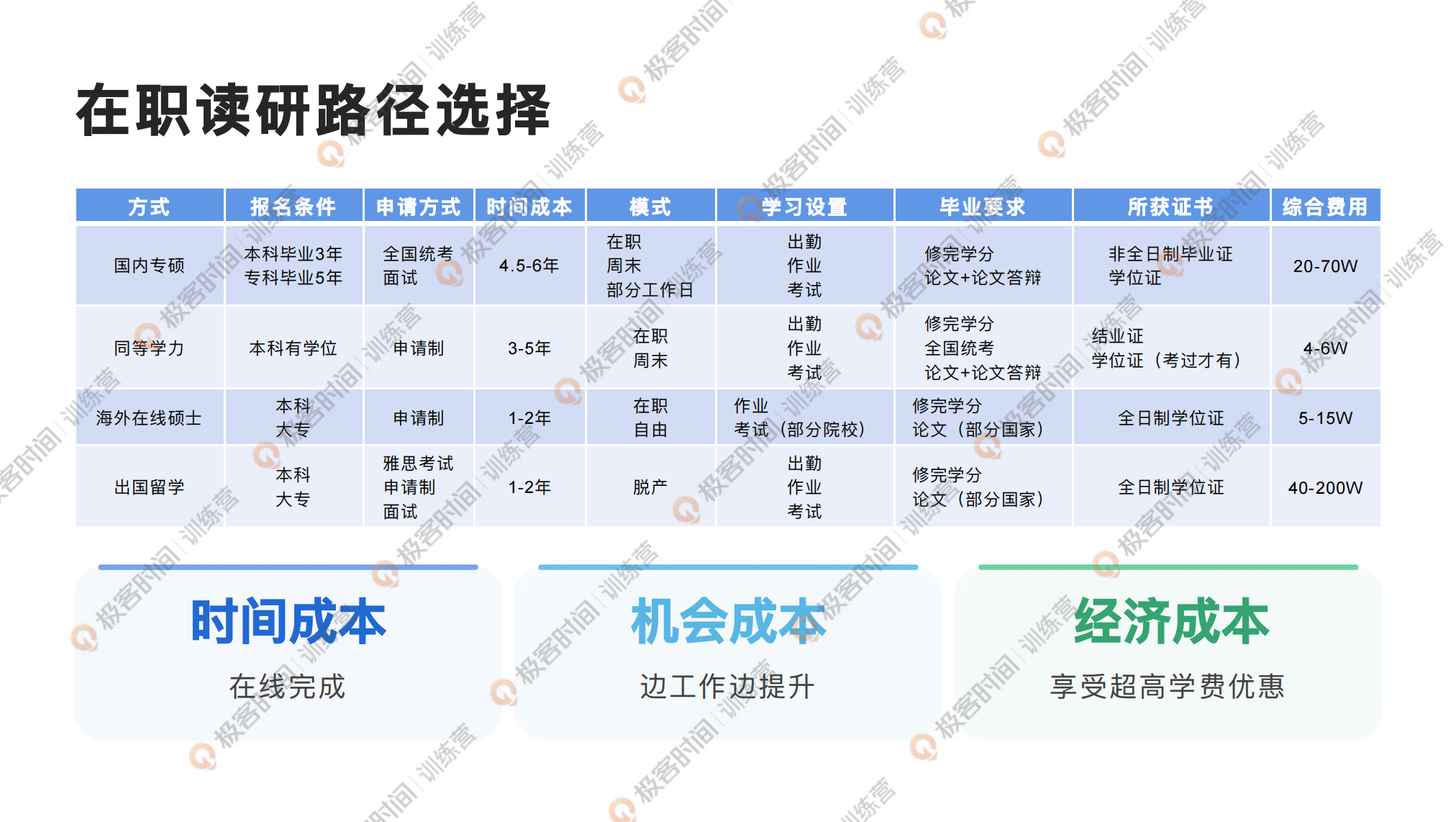 国内的在职研,它的标准学制是两到三年的时间,我们最快两到三年毕业,大家顺利毕业已经是 2029 年或者是 2030 年,差不多 4 到 5 年之后了,所以说它整体的时间成本是非常高的。现在技术发展迭代这么快,职场竞争压力这么大,如果说我们要花四五年时间来进行系统化的提升以及学历的提升,其实它是跟不上时代发展的。像现在 AI 技术非常成熟,你学到的东西就是在与时间赛跑,越慢越没有优势。而且是否能够考试通过它也是一个未知数,国内它就是选拔性的考试,考研的人数是非常庞大的,跟你竞争入学名额的大部分都是全日制在校学生,他们的主职就是在学习,像我们在职人士重心在工作上,只能是通过业余的时间来学习,没有办法去投入那么多的时间。去年有 300 多万在职研究生报名,最终通过考试的可能只有 100 多万人,尤其是计算机专业,它的报录比是非常低的,只有百分之十几,相当于 100 多个人报名,最终只有十几个学生能够去获得入学名额。
