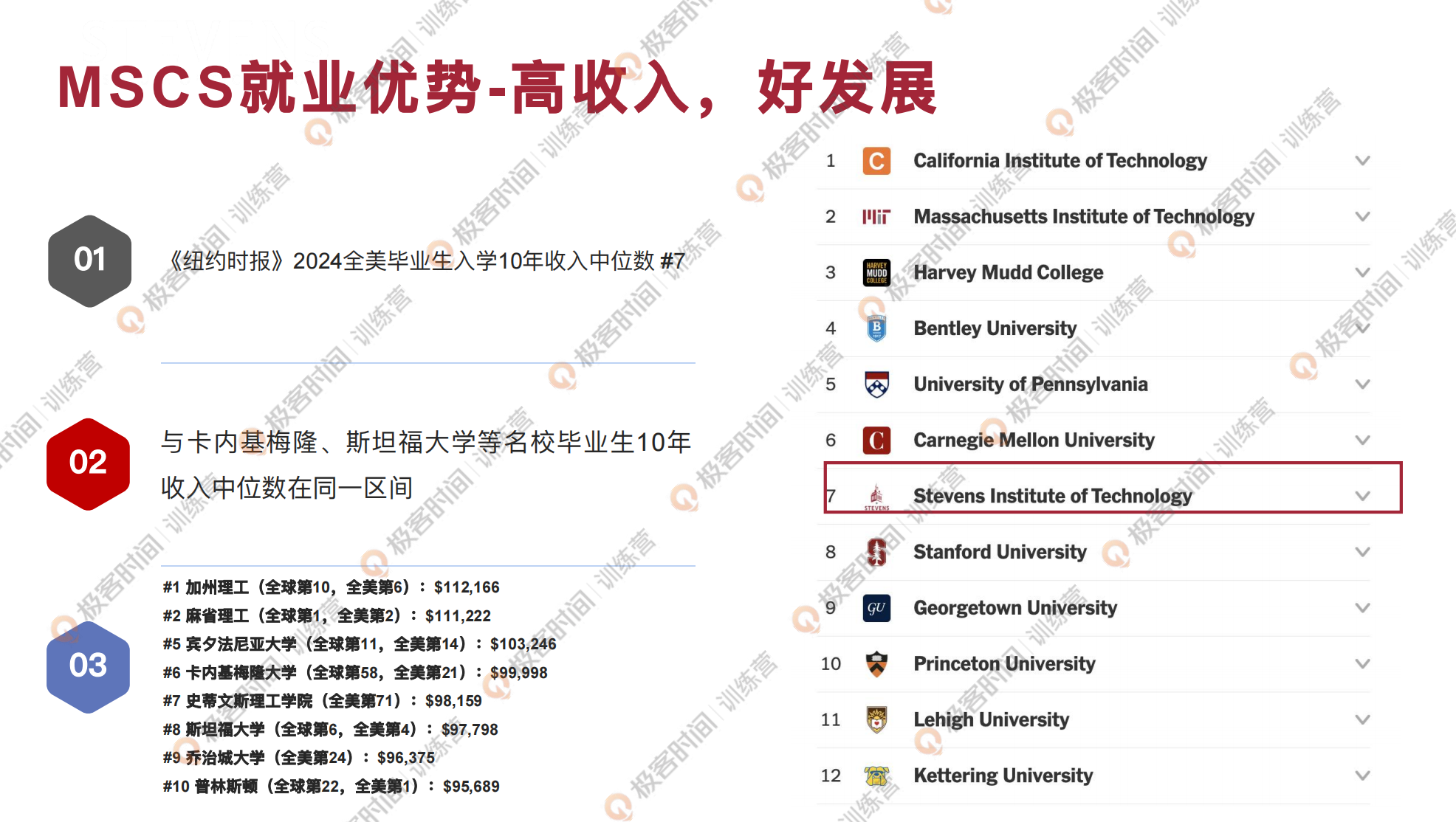 我们可以看一下纽约时报的统计,纽约时报它会去统计美国毕业生入学十年收入的中位数,史蒂文斯理工大学是排名第七的,我们可以看一下这个榜单,加州理工的学生是排到第一的,薪资收入是 11.2 万美金,麻省理工第二,是 11.1 万美金,史蒂文斯理工学院的毕业生收入十年的中位数是 9.8 万美金,我们可以看到它是跟一众顶尖的名校培养出来的学生,在整个职场发展中是在同一期间的,是非常有竞争力的。
