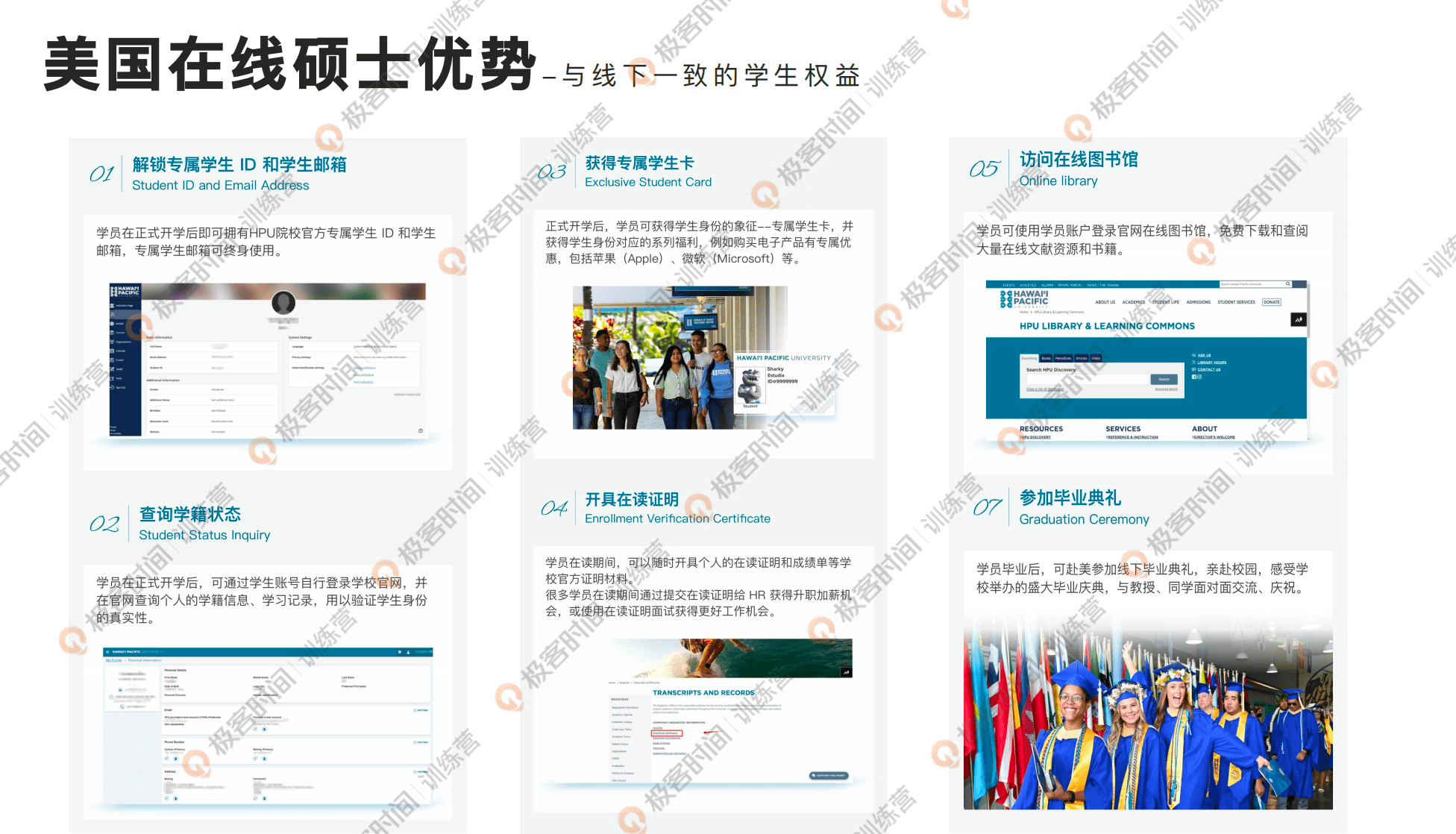 而且美国大学的在线学位项目还有一个特点就是,它对于在线学习的安排和到线下学习的学生是完全保持一致的,你享受相同的学术水准,享受相同的师资安排,一样的毕业要求,包括享受相同的学生权益,比如说大家有自己的学生卡,然后可以登录学校的图书馆去查询书籍信息、文献信息等等,以及大家也可以登录学校官网去查询学籍信息。毕业之后发的学位证书也是跟线下的学生完全相同的全日制硕士学位证书,所以这在美国其实是一种很普及的方式。基本上三分之一的美国人都体验过在线的学位项目的学习,它很成熟,而且做到了线上线下内容的一致性,这就代表着我们可以在国内通过在线学习形式就可以直接享受到美国的教育资源。