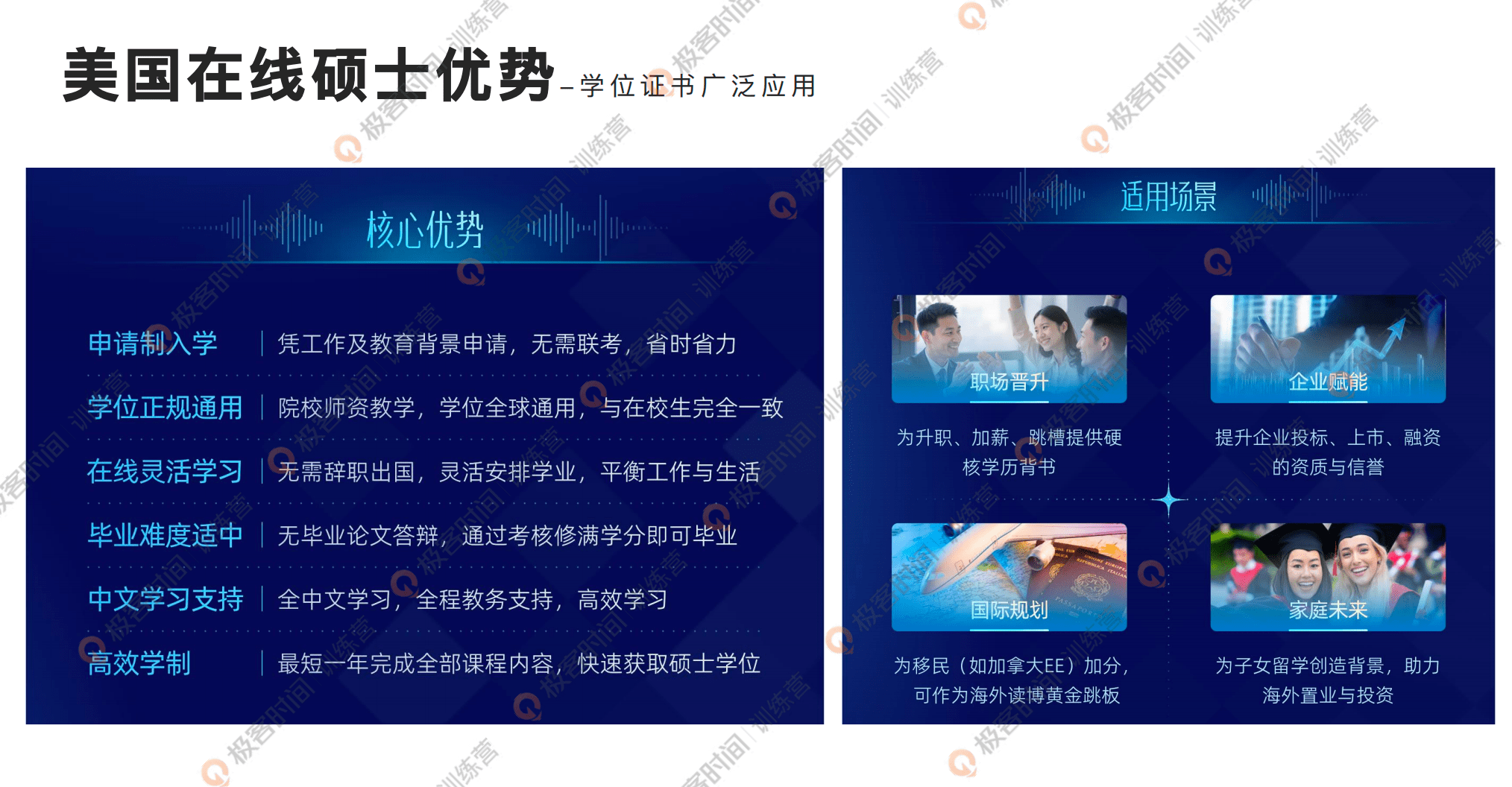 以上是我今天的分享的内容,我主要分享的内容就是美国在线硕士的特点,如果说你有在考虑学历提升,可以优先考虑美国大学的这种在线硕士项目,因为它很大的一个特点是虽然你是在线学习,但是享受的所有的学员权益,学术要求、学习安排,包括毕业之后获得的学位证书,它是跟线下的学生完全保持一致的。