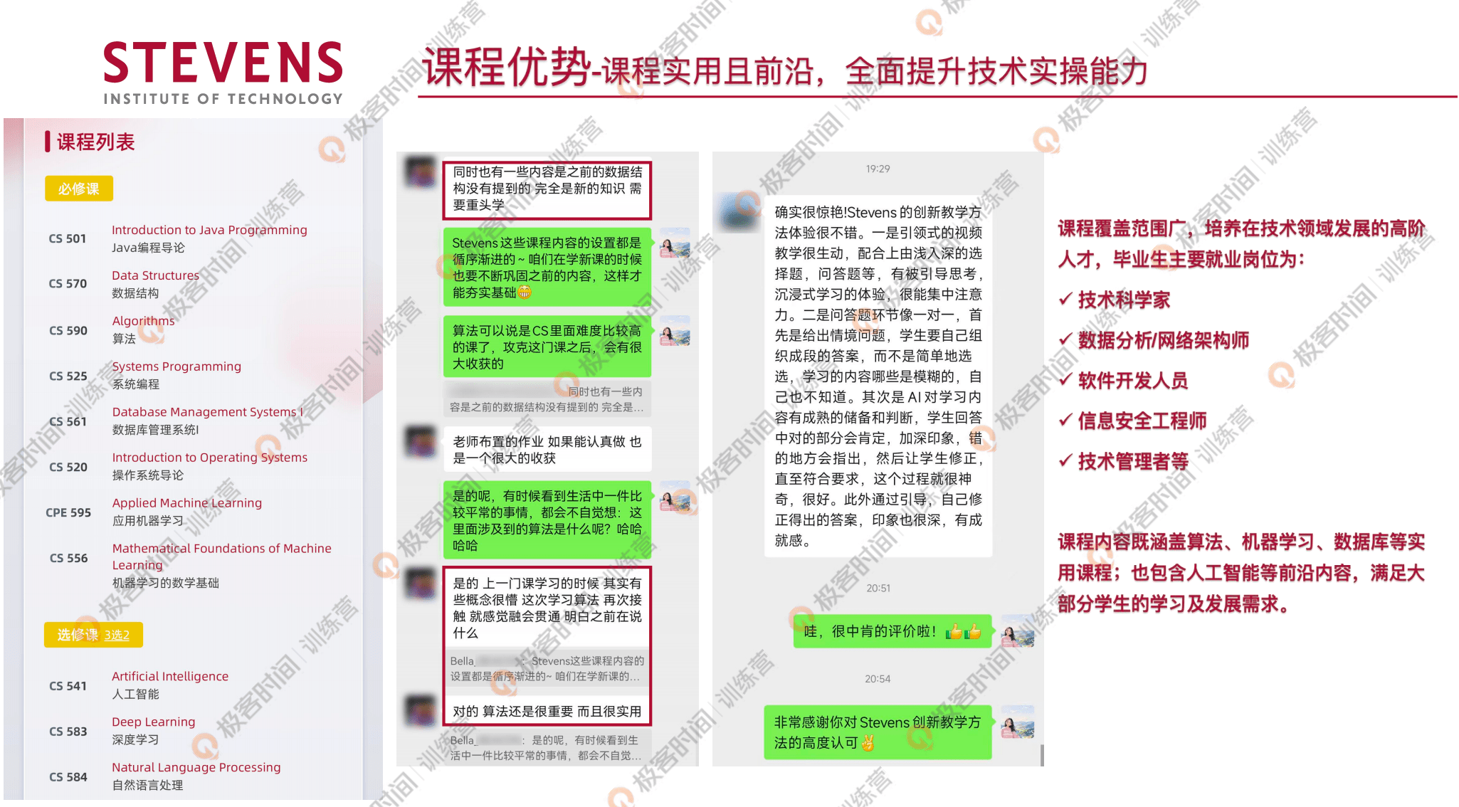 我顺便也带大家看一下,通过这个项目的学习,我们的在读学生到底有哪些真实的反馈。首先大家反馈最多的就是课程非常实用,并且前沿,能够去提升技术实操的能力。史蒂文斯的计算机科学硕士这个项目它的主要培养目标,毕业生的主要就业岗位就是技术科学家、数据分析、网络架构师、软件开发人员、信息安全工程师、技术管理者,或者是人工智能领域的从业者等,这是他未来培养的方向。