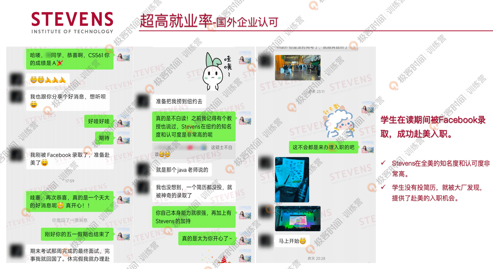 然后还有国外企业也是会认可的,这位同学他是在读期间被 Facebook 录取,也就是现在的 Meta,并且成功赴美办理了 入职。他为什么有这样的机会?是因为他把自己在领英上的简历定位到了史蒂文斯,更新了史蒂文斯计算机硕士的背景,然后 Meta 主动联系了他,给了他这样的机会。