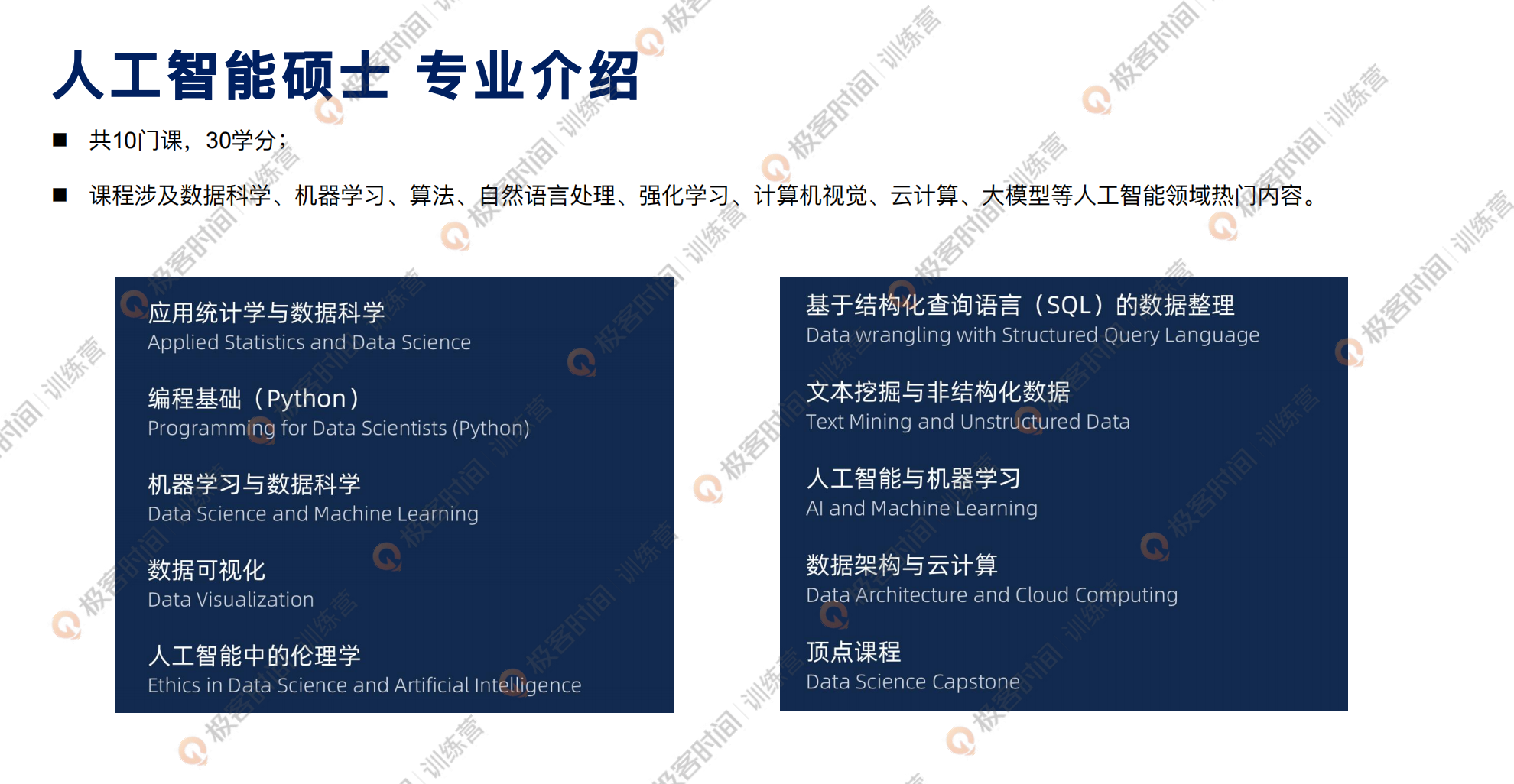 我们提供的人工智能硕士项目,一共学习 10 门课,每门课 3 个学分,修满 30 个学分就可以毕业了,它的标准学制是一年的时间。课程会涉及到数据科学、机器学习、算法、自然语言处理、强化学习、计算机视觉、云计算、大模型等人工智能领域的热门内容。从基础到进阶,到现在最热门的内容都会涉及到。通过这个项目,不仅仅能够学到 10 门专业核心课,还可以学到学校额外准备的一些专业的课程,比较符合当下最热门的技术的。