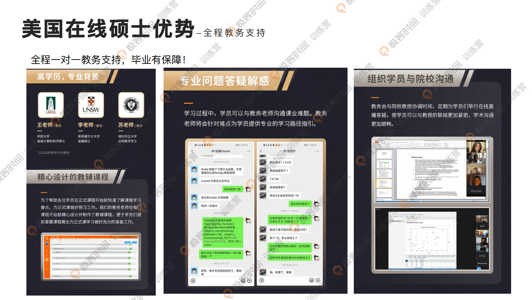 这里我再展示下我们提供的教务支持。关于计算机类的项目,我们大部分教务老师都是具备计算机硕士背景的。我们为什么会对教务老师有这么高的要求和安排?当然是因为技术领域的一个特点,同学们在学习过程中可能遇到,比如说代码卡住了,或者诸如此类的问题,这个是很正常的。我们有专业的教务老师可以帮大家去分析问题,解决问题,当然教务老师也会去负责组织班级群,我们同一学期入学的学生都可以在同一个班级群里面,那么班级群里面也有很多大佬同学可以去解决大家遇到的问题。