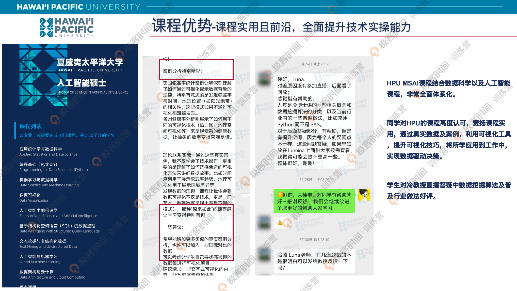 我们再来看一下在读同学们的反馈,夏威太平洋大学的人工智能硕士项目整个的课程设置是非常以实践为导向的,这也是美国大学的特点,它的教学内容是真正的贴合大家的职场发展的,这也是为什么在职人士可能选择计算机专业的时候会优先去选择美国的院校。