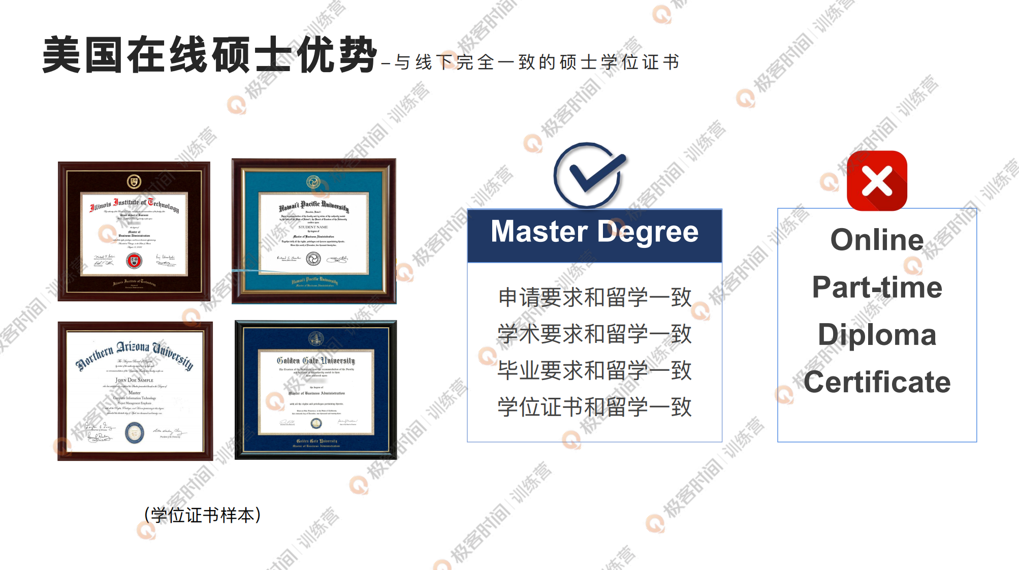 我这里展示一下学位证书,大家通过项目的学习获得跟线下完全相同的硕士学位证书,没有任何 online、 part-time、 Diploma 或者是 Certificate 等这样的字样,它就是正式、正规的 Master Degree 。