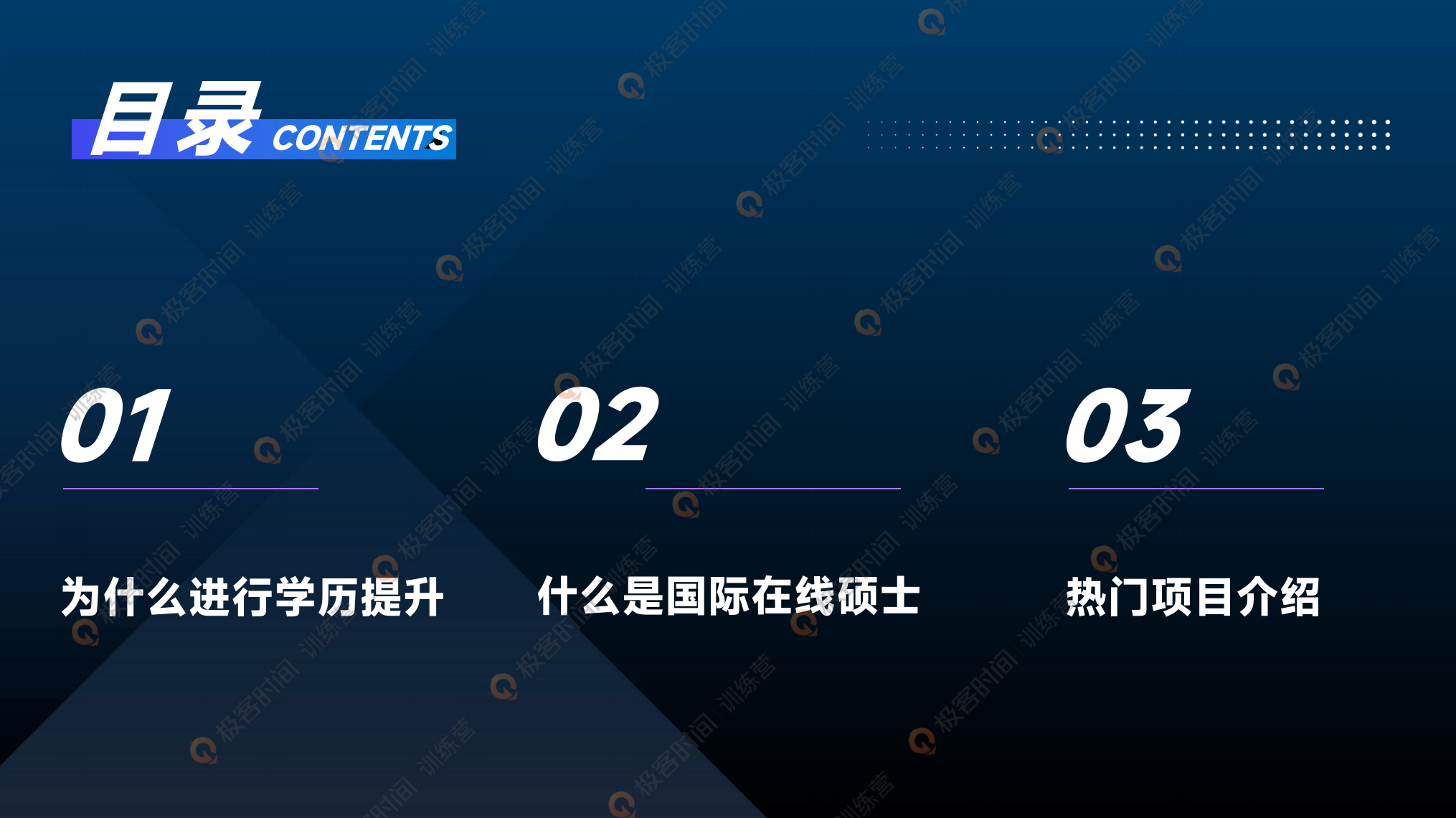 今天我们主要会介绍三部分的内容:第一个部分是为什么要进行学历提升,在职场的发展中,投入时间和精力进行学历提升,它是不是一个值得的选项?第二个部分是国际硕士的含金量怎么样?企业它是不是认可的?在我们职场发展环节是不是认可?第三个部分是关于我们项目详细的介绍,这也是我们今天最核心的内容,想了解项目信息的同学可以重点关注一下。
