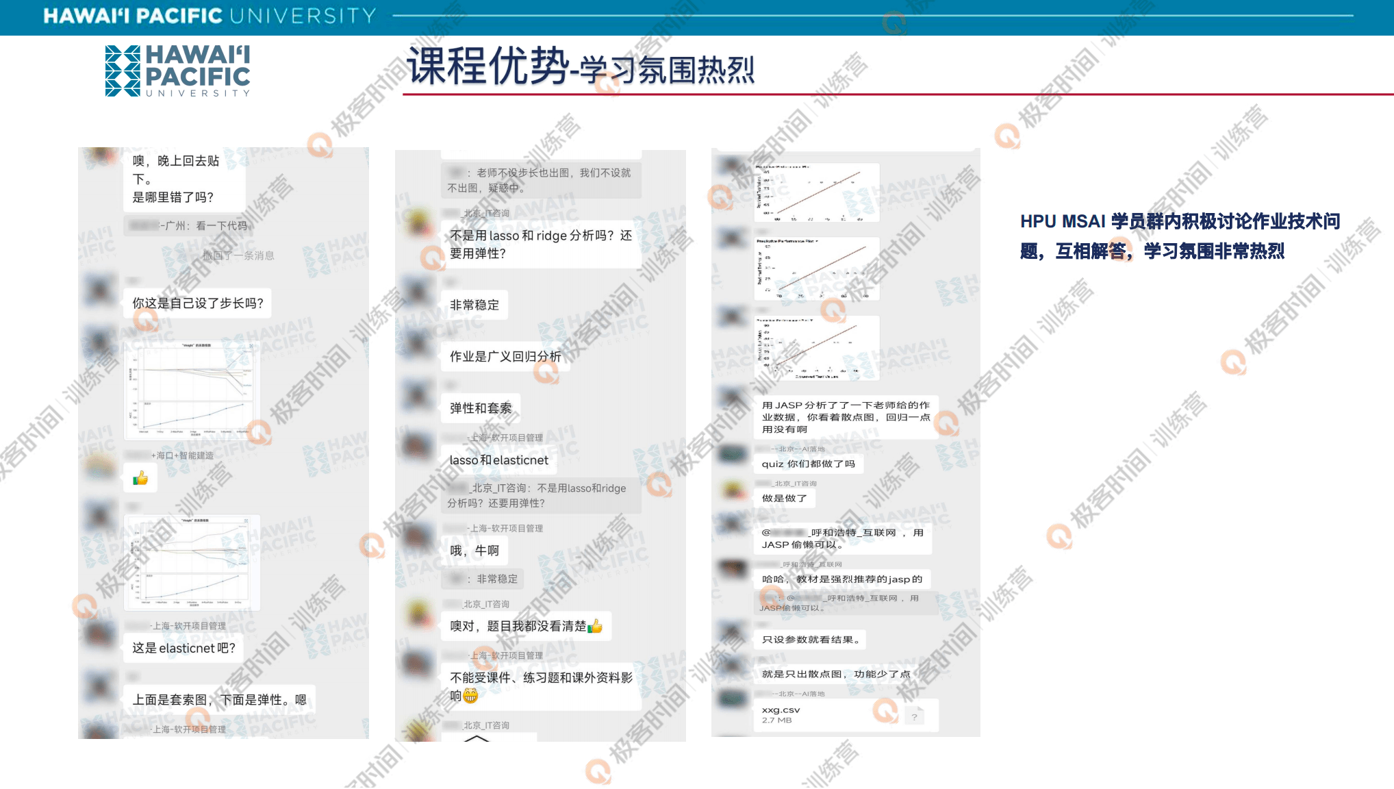 夏威夷太平洋大学的人工智能硕士项目,在学习过程中每门课也会安排教授直播答疑课,安排的频次要以教授为准。这个答疑课它是可以用中文进行的,所以不需要担心语言的问题。我们可以看到同学们学完一门课之后,他的总结会很长,收获很大。