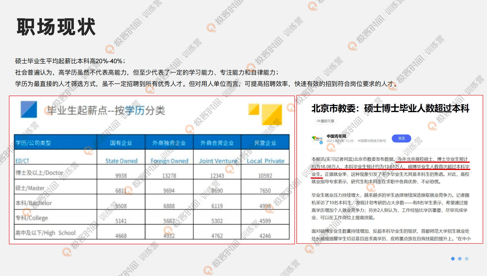 我们再来看一组教育部统计的数据,硕士毕业生的平均起薪要比本科高 20% 到 40%,北京市教委发现大部分学生为了未来就业增强自己的竞争力,会继续进行硕士深造,我们可以想象到在未来的整个职场环境中,你身边高学历的竞争者会越来越多。有很多同学现在是本科的学历,如果身边的同事都已经是硕士,那么本科的竞争力就会逐渐减弱,所以说学历提升的主要目的还是确保自己的竞争力。