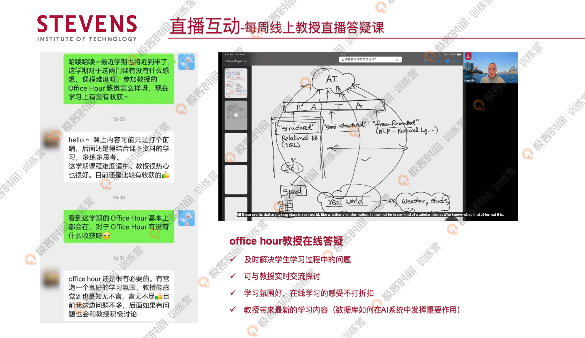 除此之外,这个是我们每周线上教授的直播答疑课的展示,在日常的教授视频课里面,他会教授大家技术内容,在答疑课里面也会给大家带来新的比较新的思考方式,可以保证大家跟教授有更多的交流,实时交流互动。以上就是我们史蒂文斯理工学院的情况。